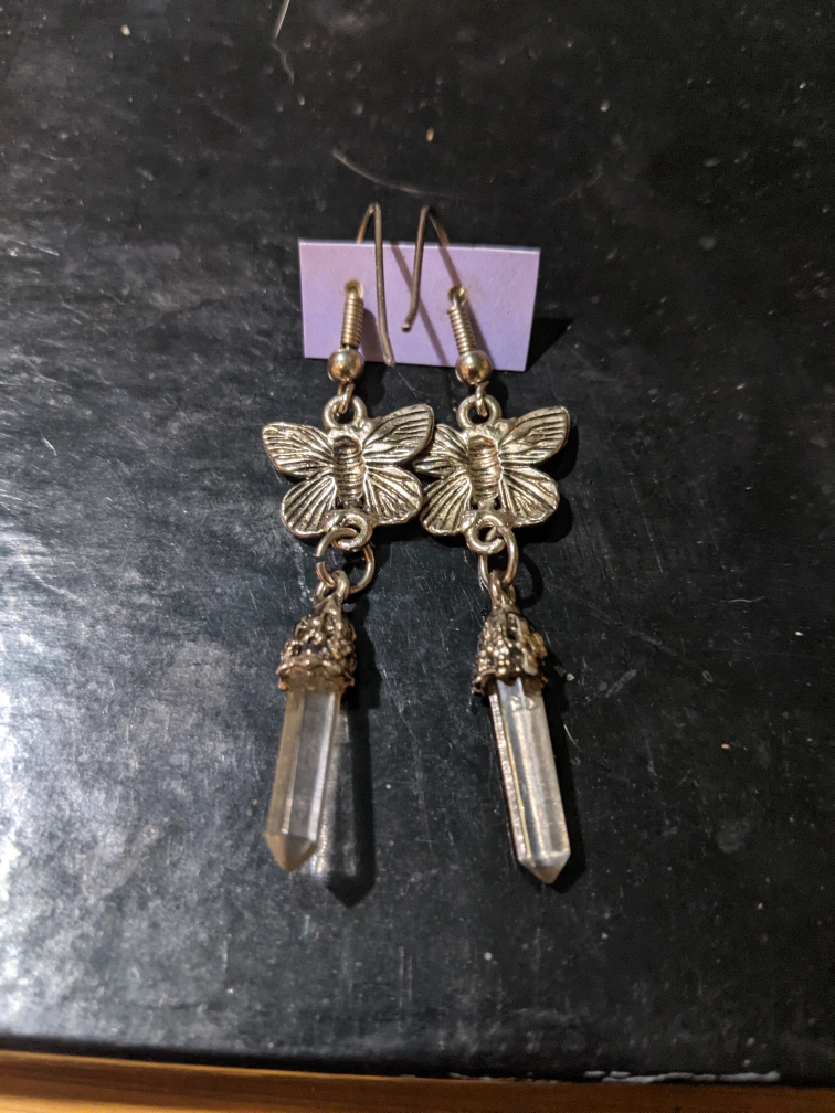 These are a pair of silver-tone drop earrings. They feature a butterfly design and clear crystal drops. These earrings are in good condition and would make a great addition to any jewelry collection