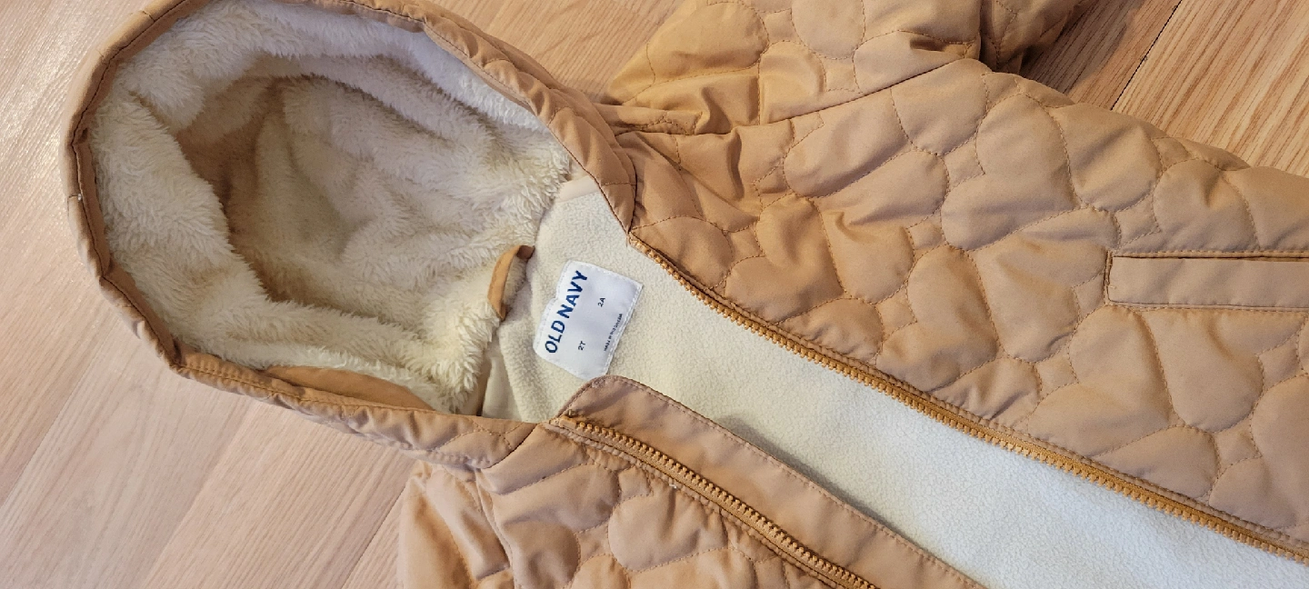 Old Navy toddler jacket in size 2T Light brown colour with a quilted pattern of hearts Sherpa lined Warm and not bulky Excellent condition, no stains or signs of wear