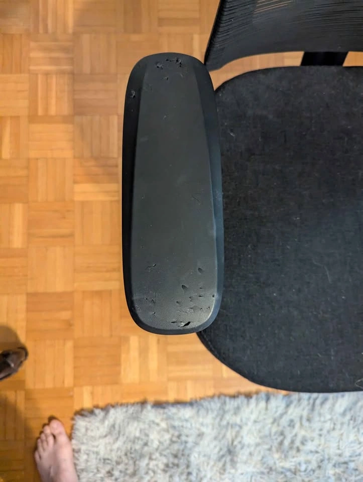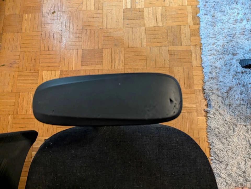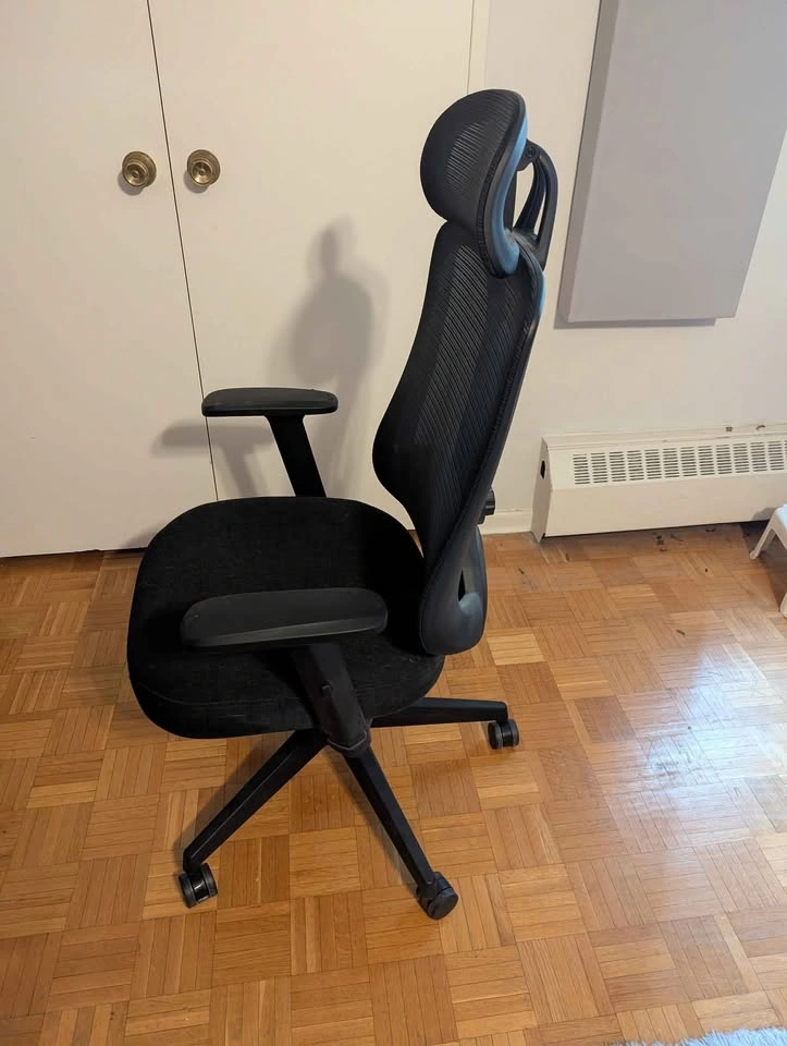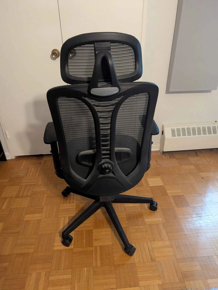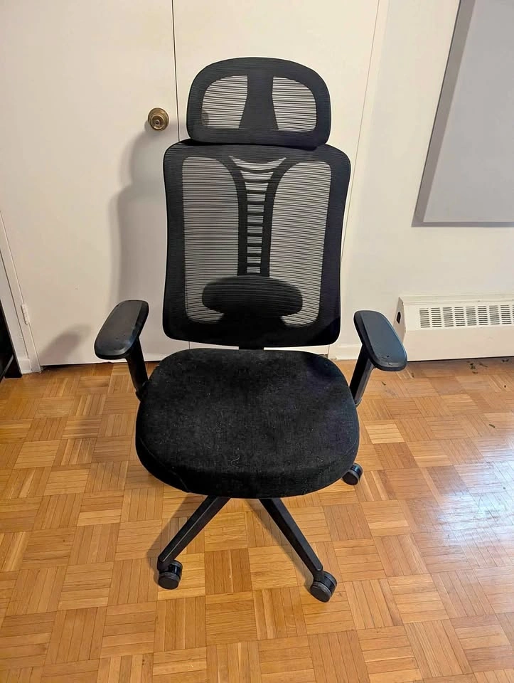 This is a comfortable and functional black ergonomic office chair, perfect for a home office or study space. It features a breathable mesh back, adjustable headrest, a padded seat, adjustable armrests and adjustable lumbar support for customizable comfort. The chair is in good condition except for a bit of damage on the arms shown in the pictures. Has a wheeled base for easy mobility!