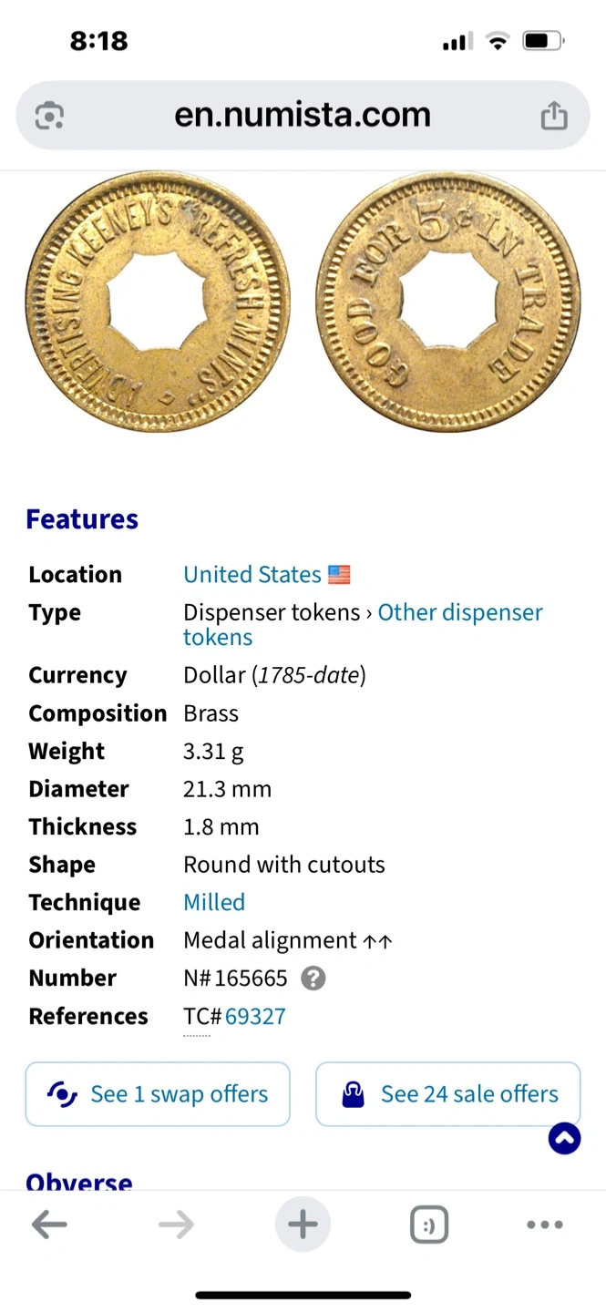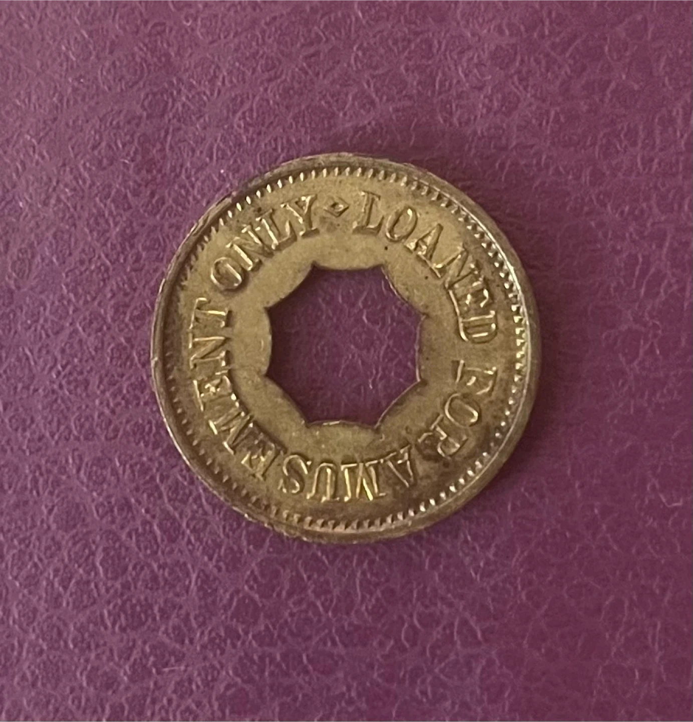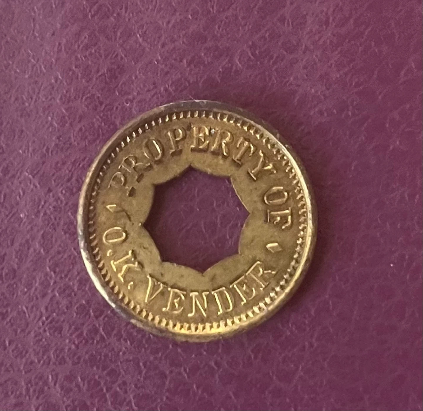 Selling a set of vintage amusement tokens. They appear to be made of brass and have a round shape with cutouts. One token reads 'AMUSING KEENEY'S ALWAYS FRESH VIMINIS' and the other says 'FOR GOOD TRADE'. Another token says 'ONLY LOANED FOR AMUSEMENT' and the last one reads 'PROPERTY OF O.K. VENDER'.