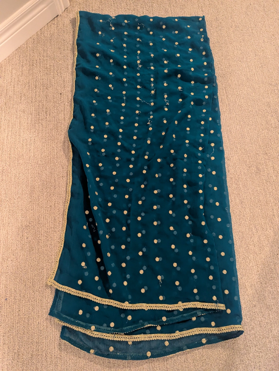 Beautiful teal and gold salwar kameez with intricate embroidery. It's in great condition and ready for a new home! The fabric is lightweight and comfortable, perfect for any special occasion or festive event