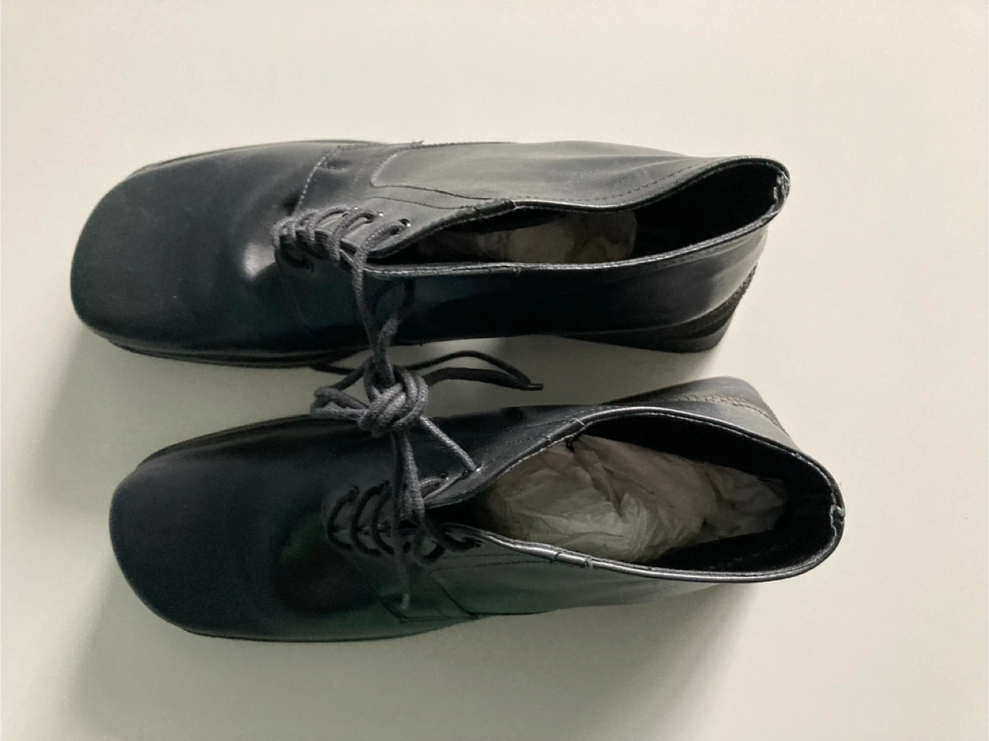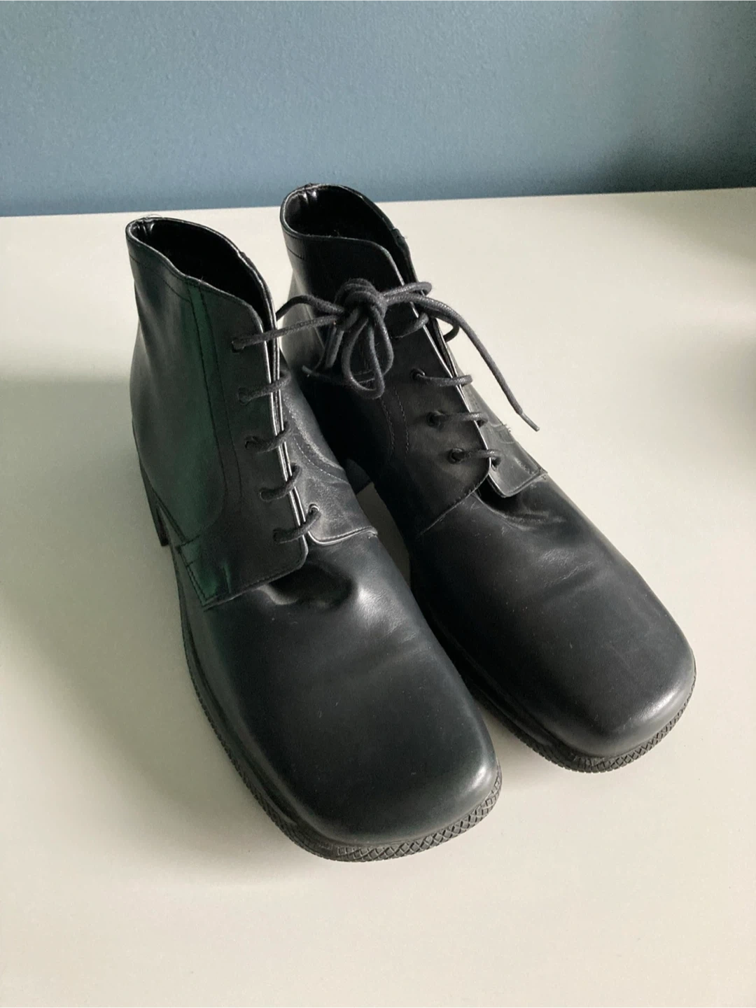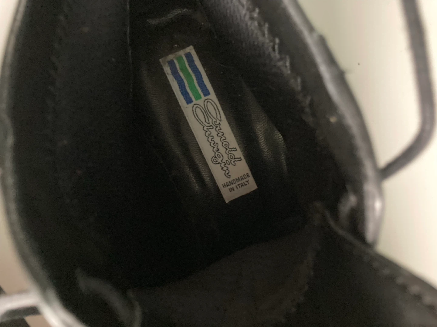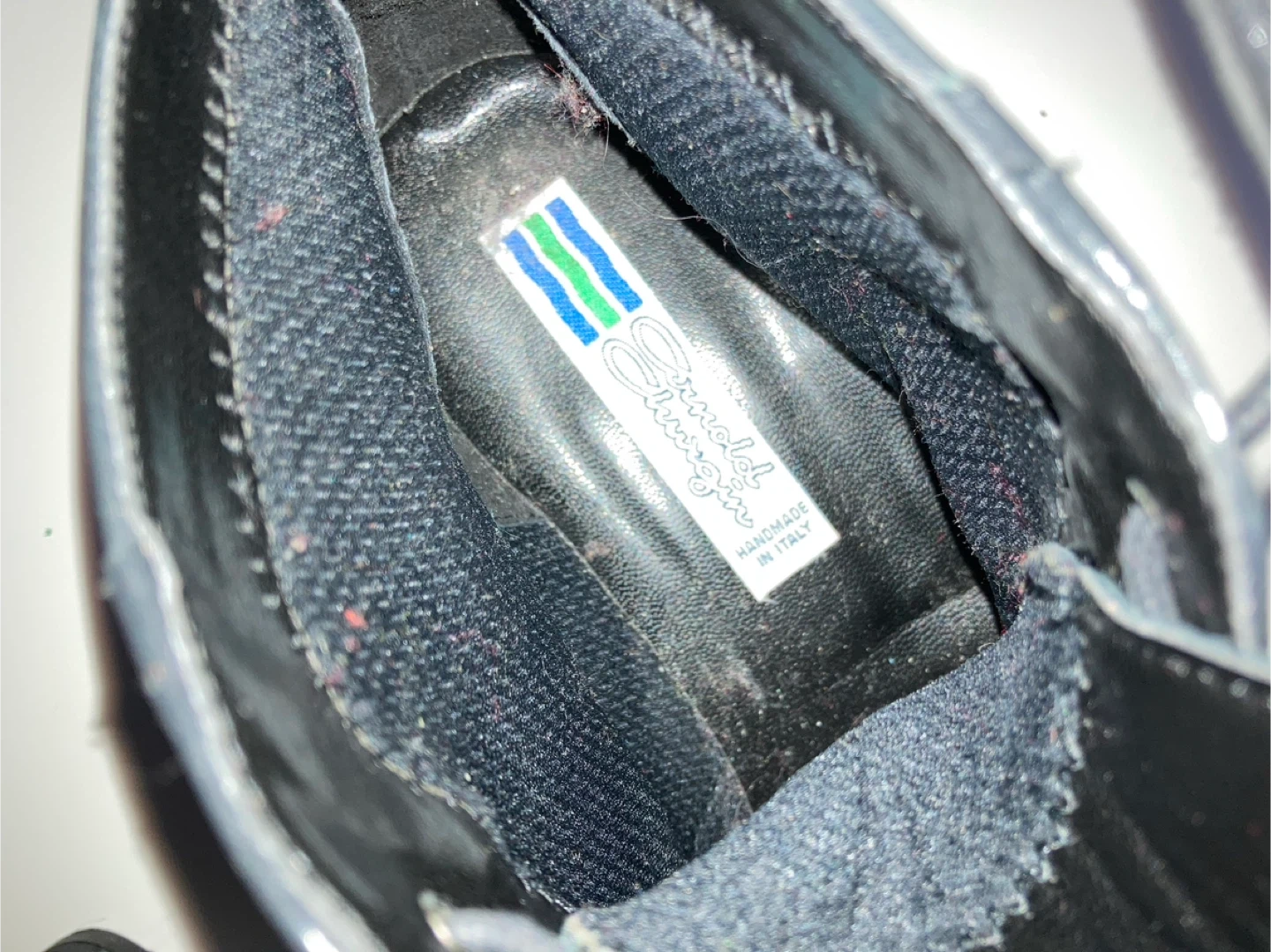 These are a pair of Arnold Churgin black leather ankle boots. They appear to be in good condition. They are handmade in Italy.