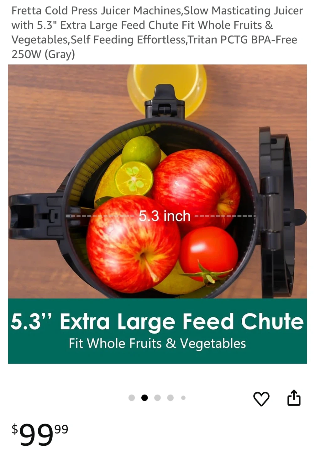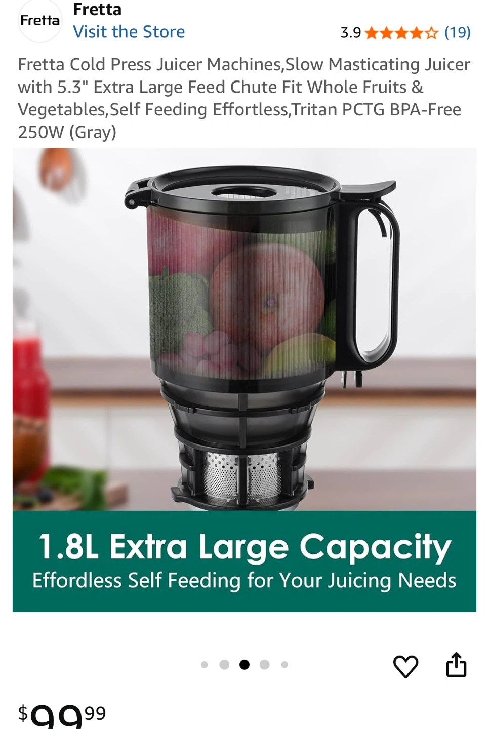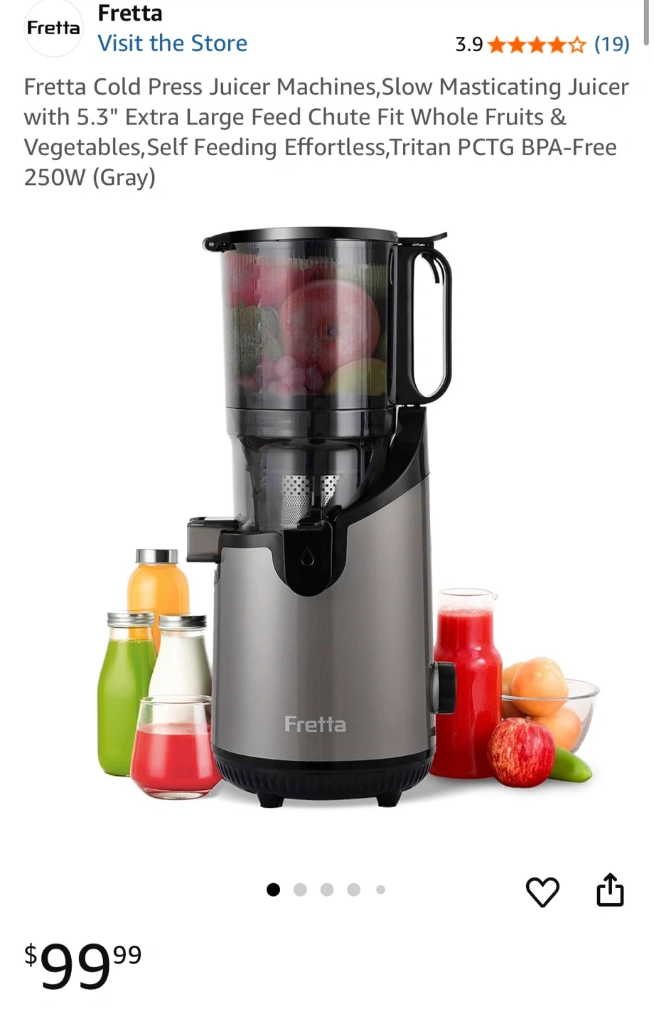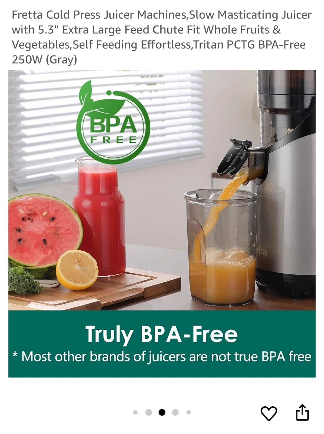 Selling a Fretta Cold Press Juicer in excellent condition! This slow masticating juicer has a 5.3" extra-large feed chute, making it easy to juice whole fruits and vegetables. It features a 1.8L extra-large capacity and is self-feeding for effortless juicing. It's also made with Tritan PCTG BPA-Free material and operates at 250W.