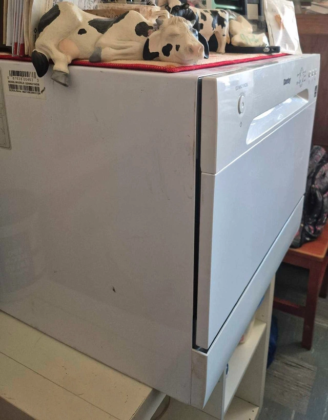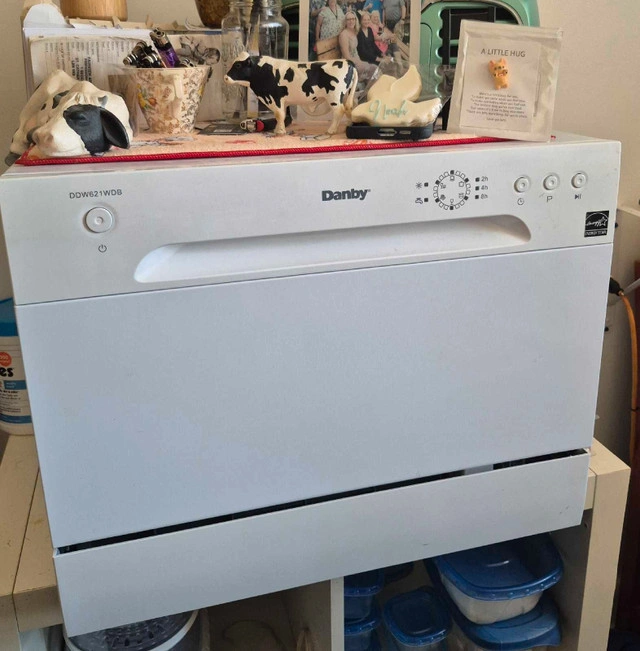 This Danby countertop dishwasher is perfect for small spaces. While it's in used condition, it's been well-maintained and works great for apartments or small kitchens. It has a compact design but still offers enough space for your daily dishes. It is white and is model number DDW621WDB. * Compact design * Energy Star compliant * Multiple wash cycles