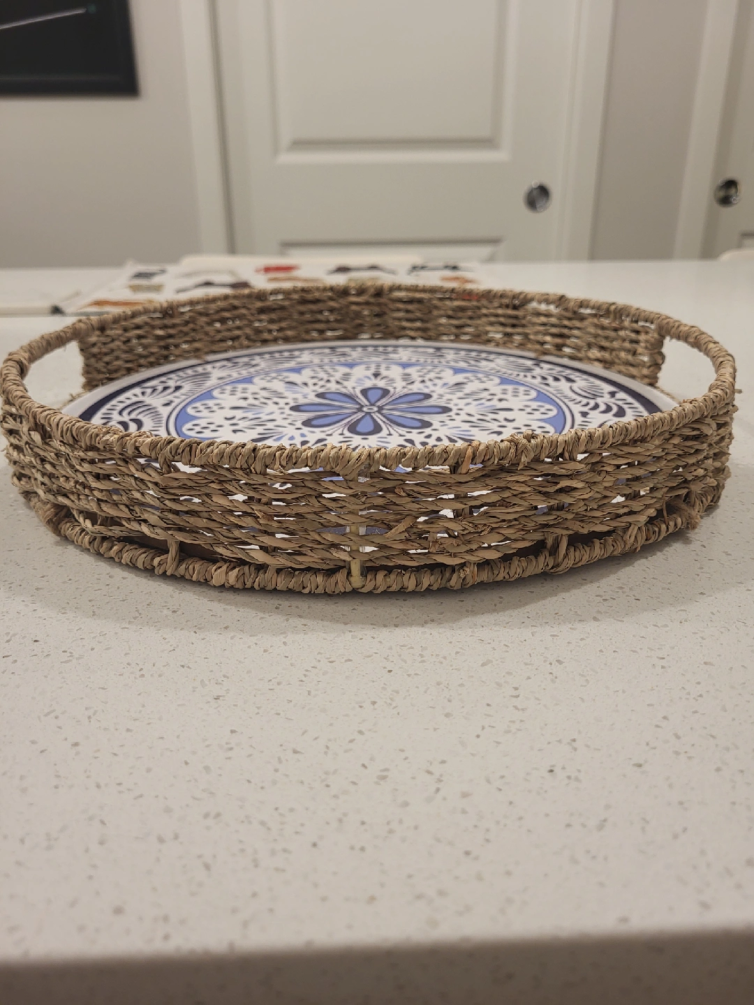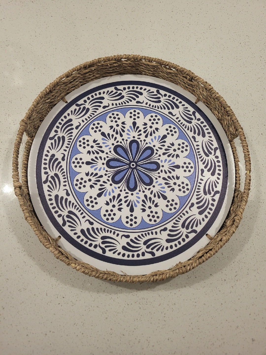 Selling a lovely decorative round tray! It has a beautiful blue and white patterned centre, surrounded by a woven edge. It's perfect for adding a touch of style to your home decor