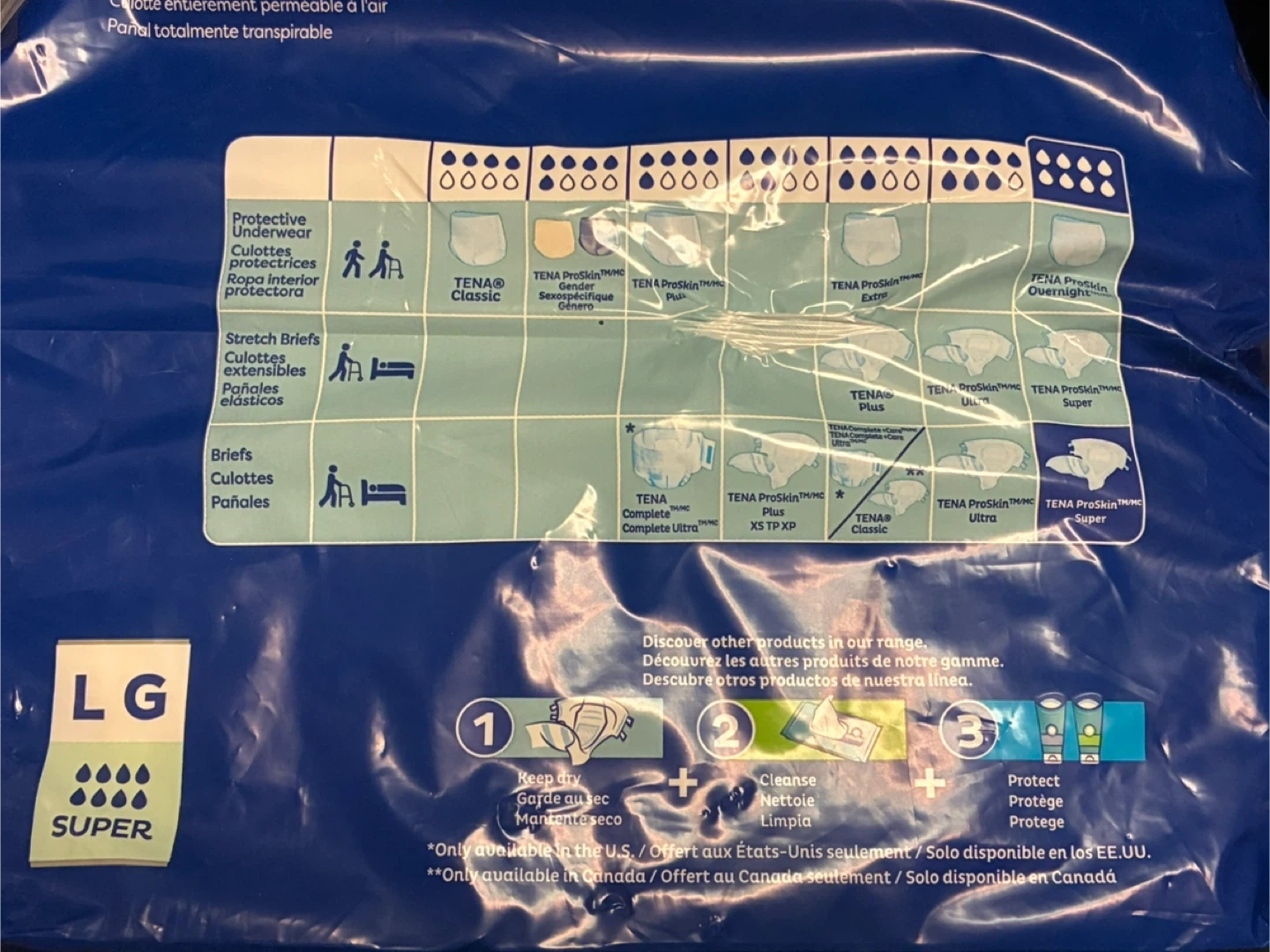 Selling a new pack of TENA ProSkin Super Absorbancy briefs/adult diapers. They're size large, fitting 48"-59" (122 cm - 150 cm). The pack contains 28 briefs. They feature 3x Dry Soft Protection and are designed with an Insta-Dri Skin Caring System Have multiples new packages! Too small for my mom now so need to get rid of them : ( 📍 Located Downtown Toronto! College Street and Spadina Ave 🤝 Pick up only 🕣 Available most weeknights 💰 Cash or eTransfer DirectDep at pickup