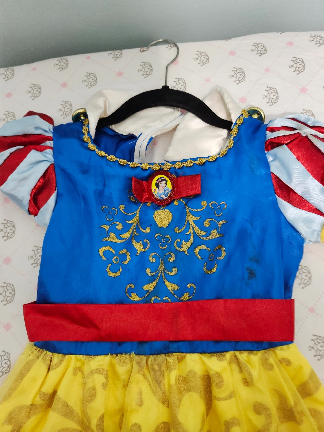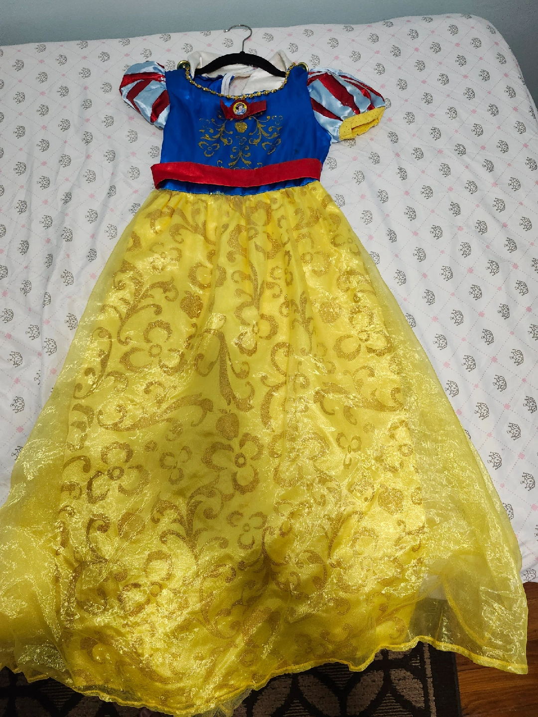 Selling a Snow White costume dress. It features a blue and red bodice with a yellow skirt. Perfect for dress-up or Halloween!