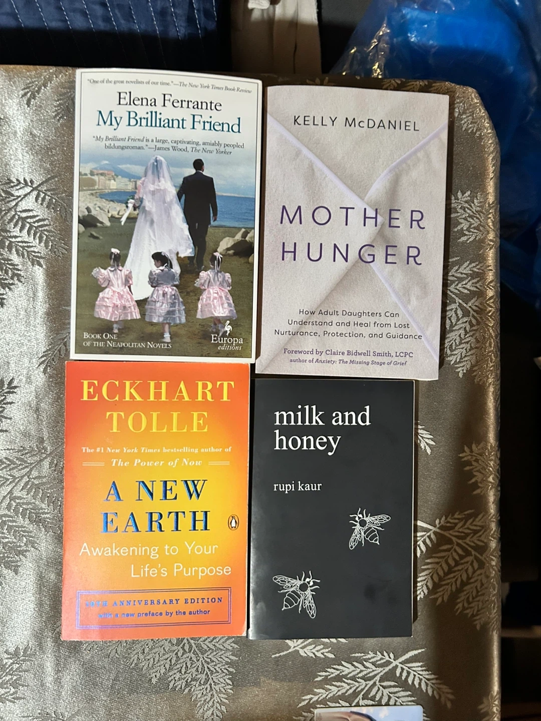 Selling a collection of books, including the Scott Westerfeld Uglies series (Pretties, Specials, Extras) and The Glass Castle by Jeannette Walls, plus others like My Brilliant Friend by Elena Ferrante, Mother Hunger by Kelly McDaniel, A New Earth by Eckhart Tolle, and Milk and Honey by Rupi Kaur $5 each or $35 for all books