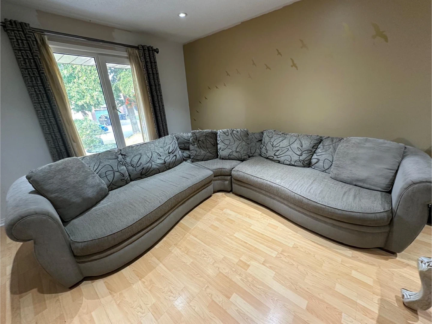 Selling a comfortable grey sectional sofa. It comes with patterned throw pillows as pictured. The sofa is in good condition and ready for a new home. Perfect for a living room or family room!