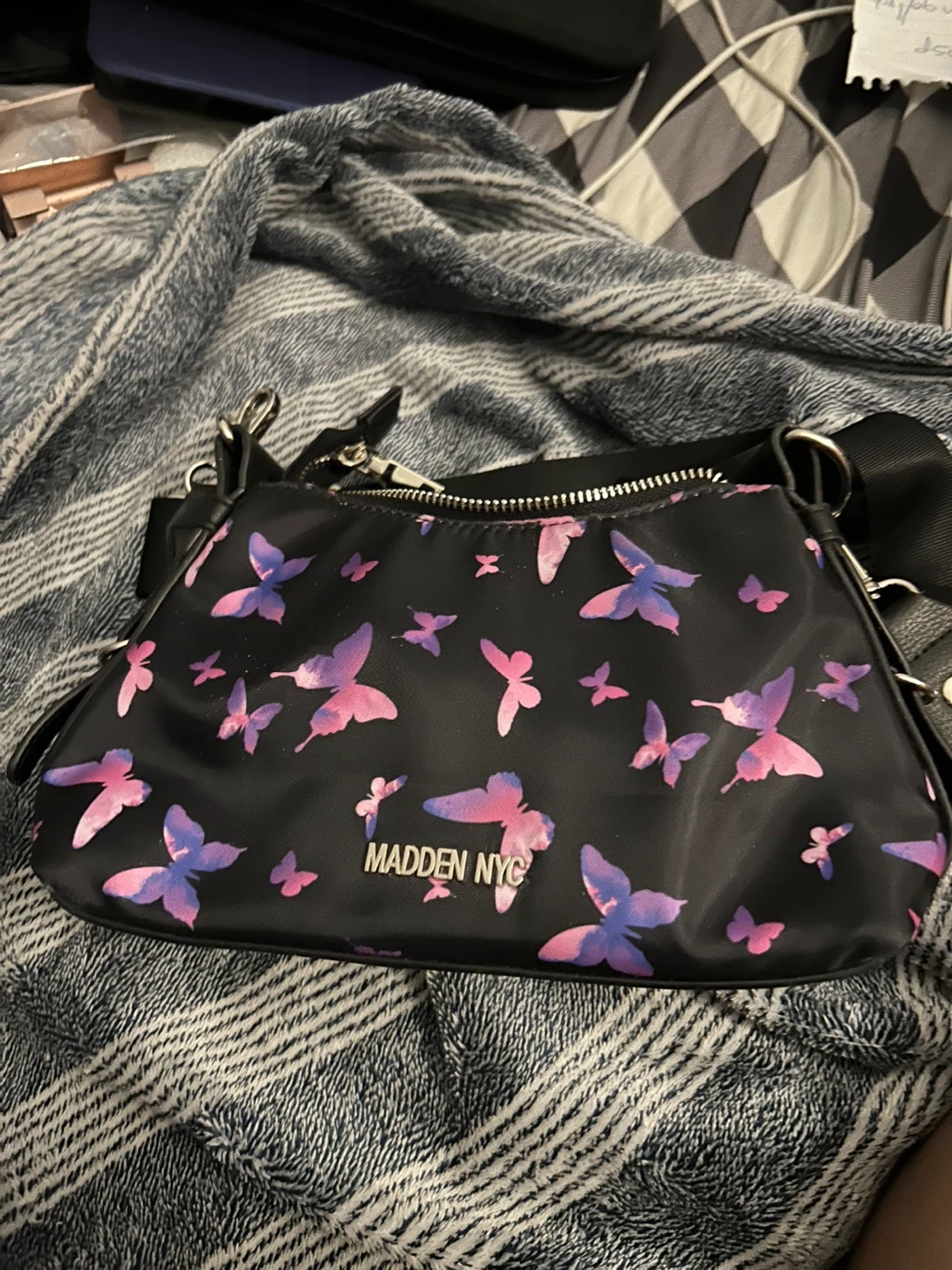 Check out this cute Madden NYC crossbody bag! It features a fun butterfly print and a chain detail. Perfect for adding a little flair to any outfit!