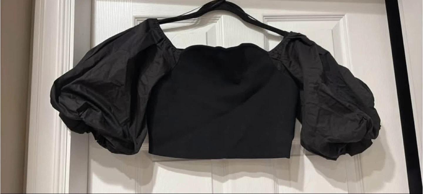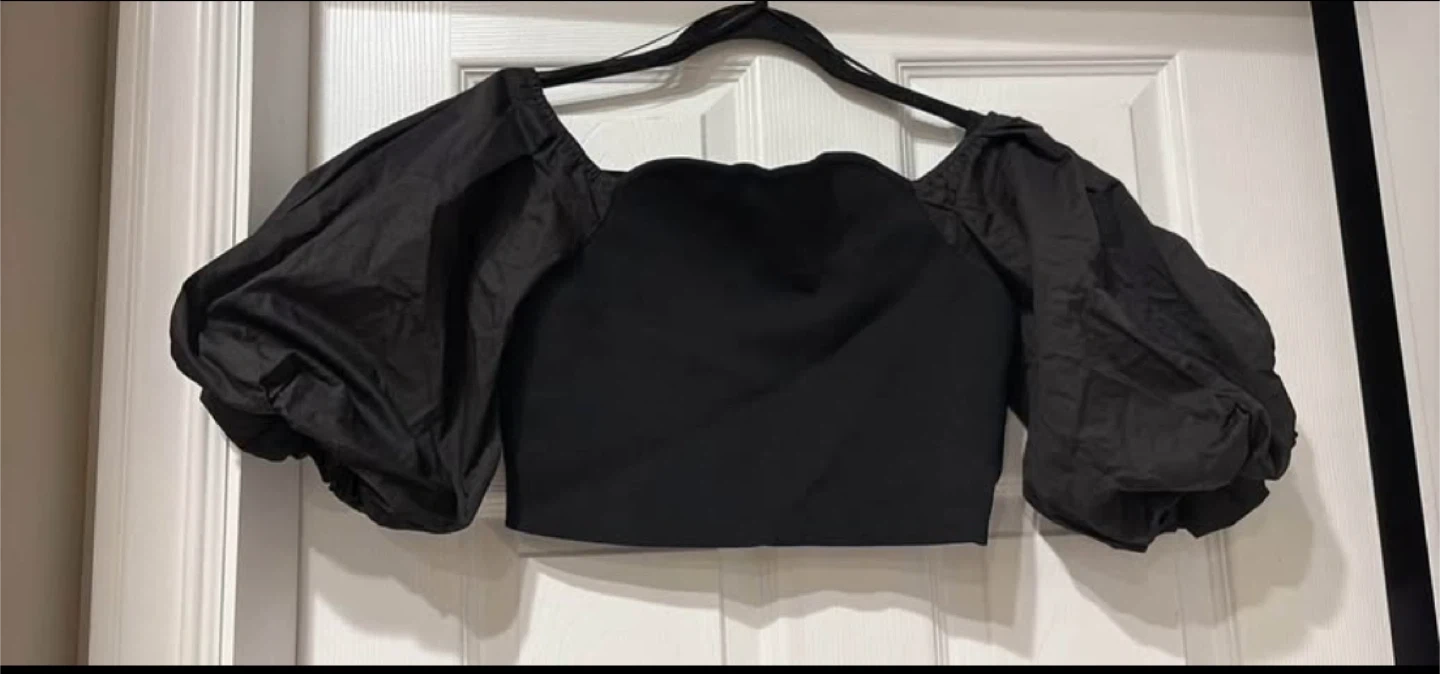 Selling a cute Zara black puff sleeve top in size L! It's in great condition and perfect for adding a bit of flair to any outfit. The material is comfy and the puff sleeves give it a unique look