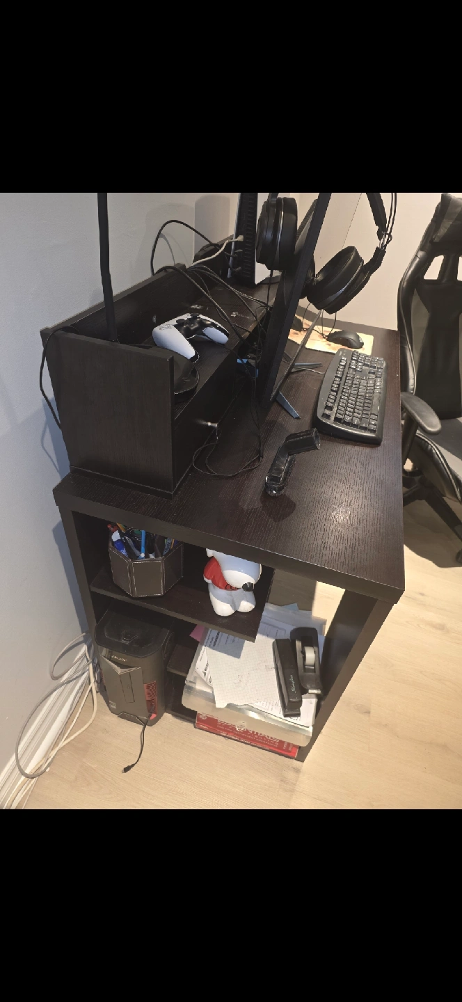 Selling a dark brown desk with a built-in shelf! It's perfect for a home office or study space. It's in great condition and ready for a new home. The desk is sturdy and provides ample workspace.