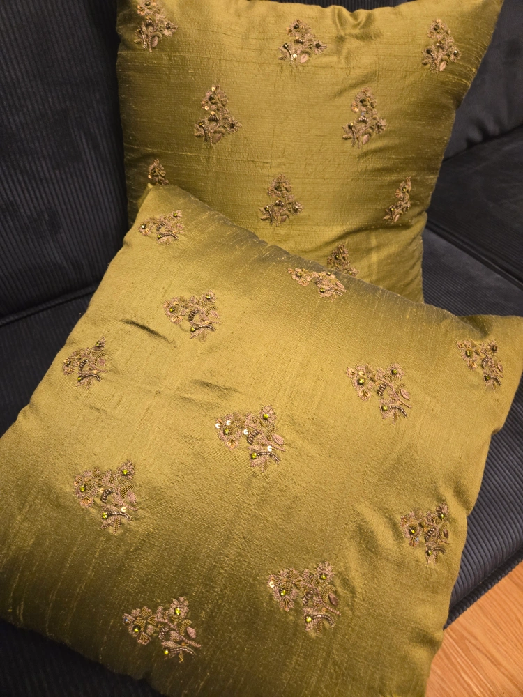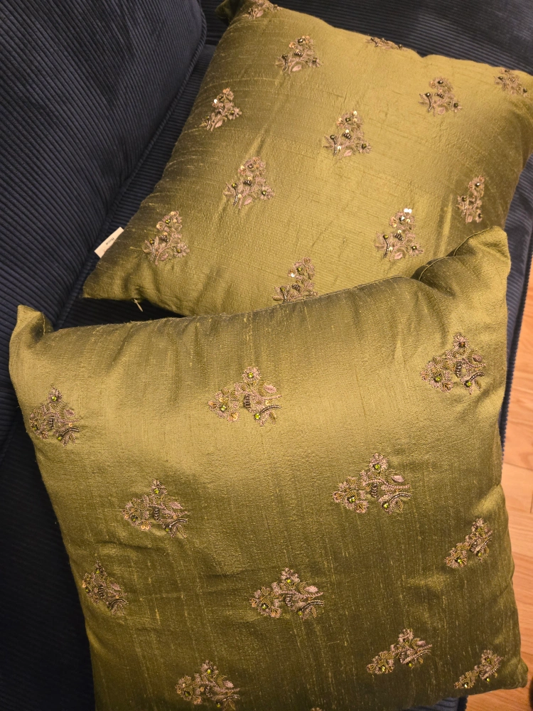 Add a touch of elegance to your home with this decorative pillow! The olive green colour and intricate floral beading make it a stylish addition to any couch or bed. It's in great condition and ready to find a new home