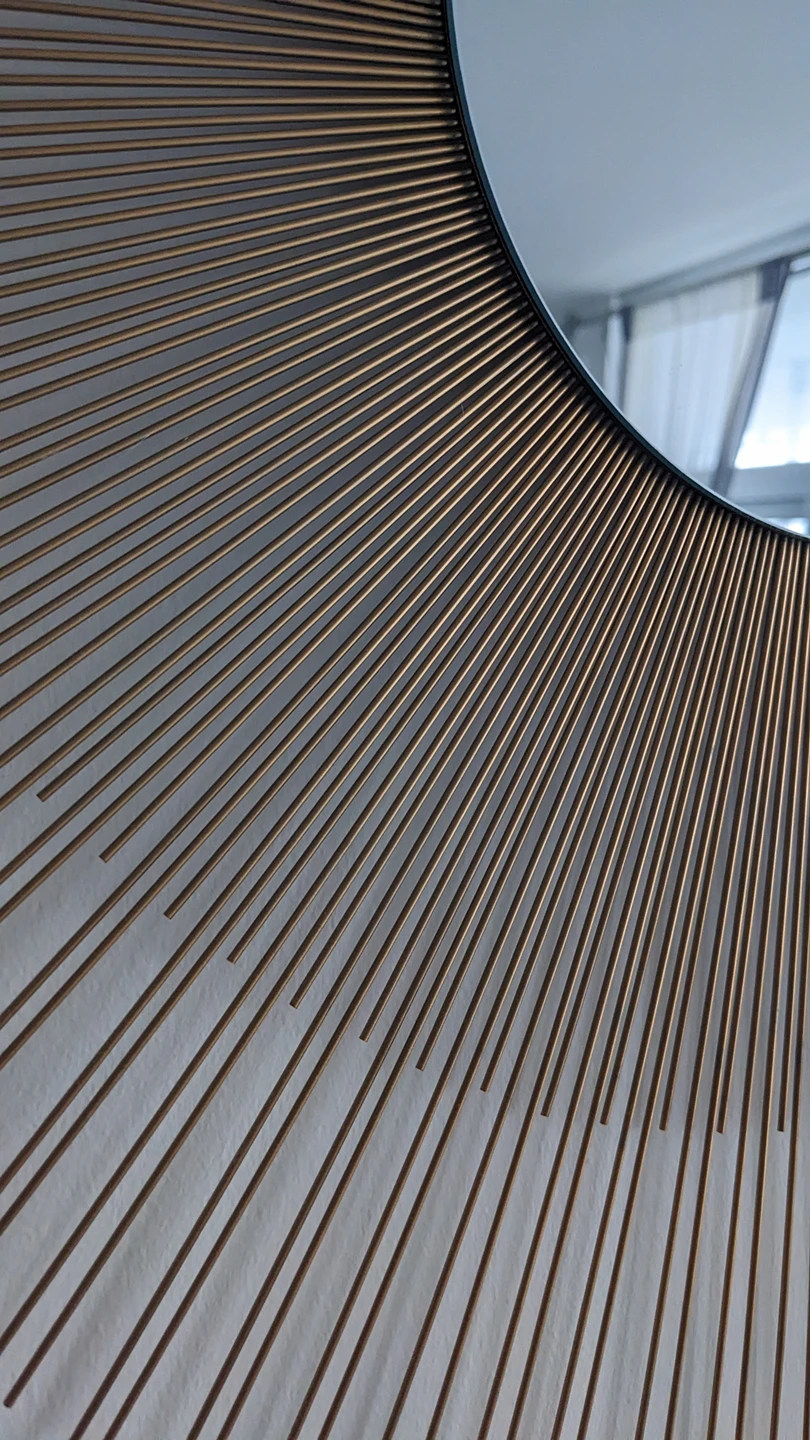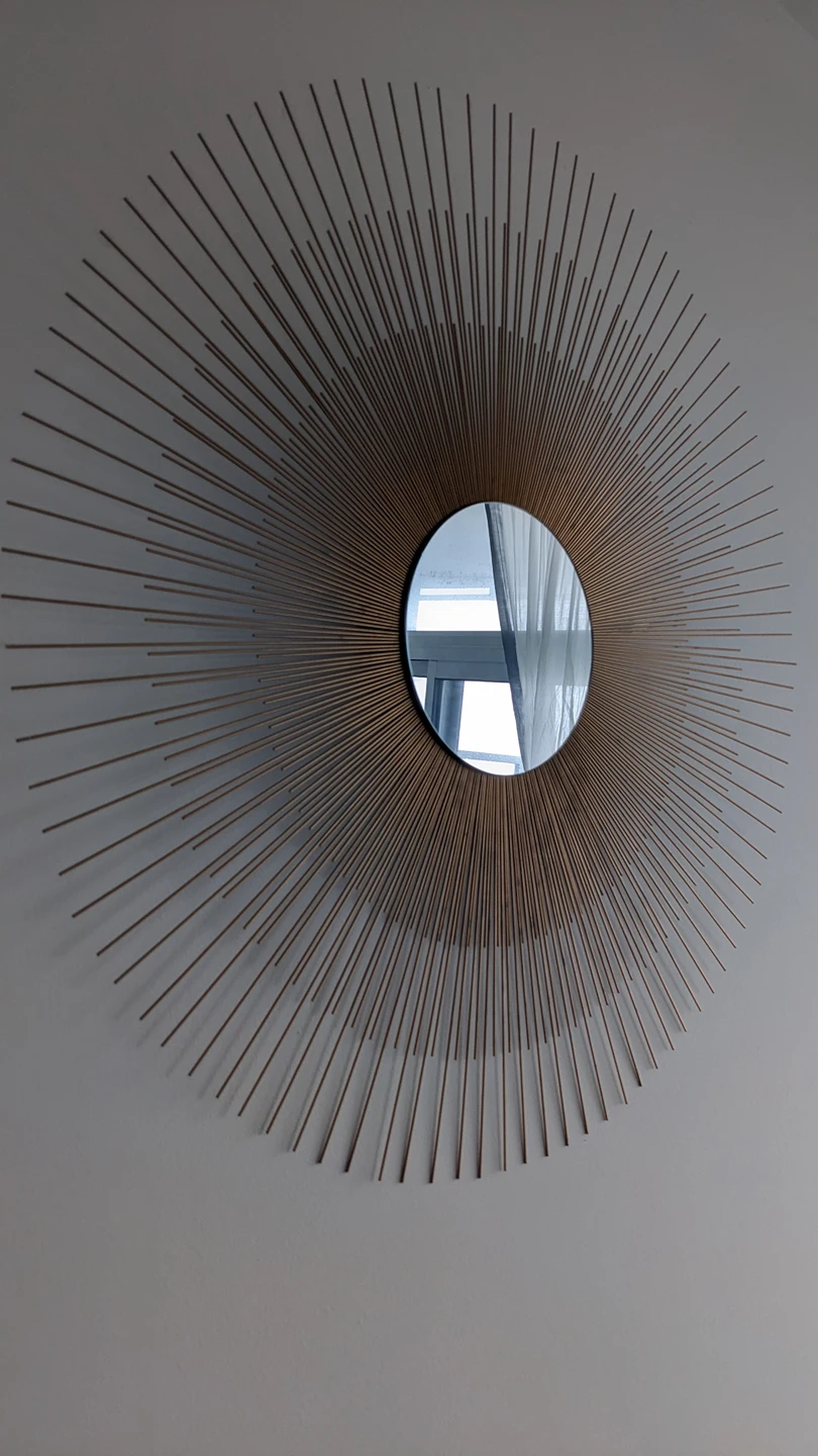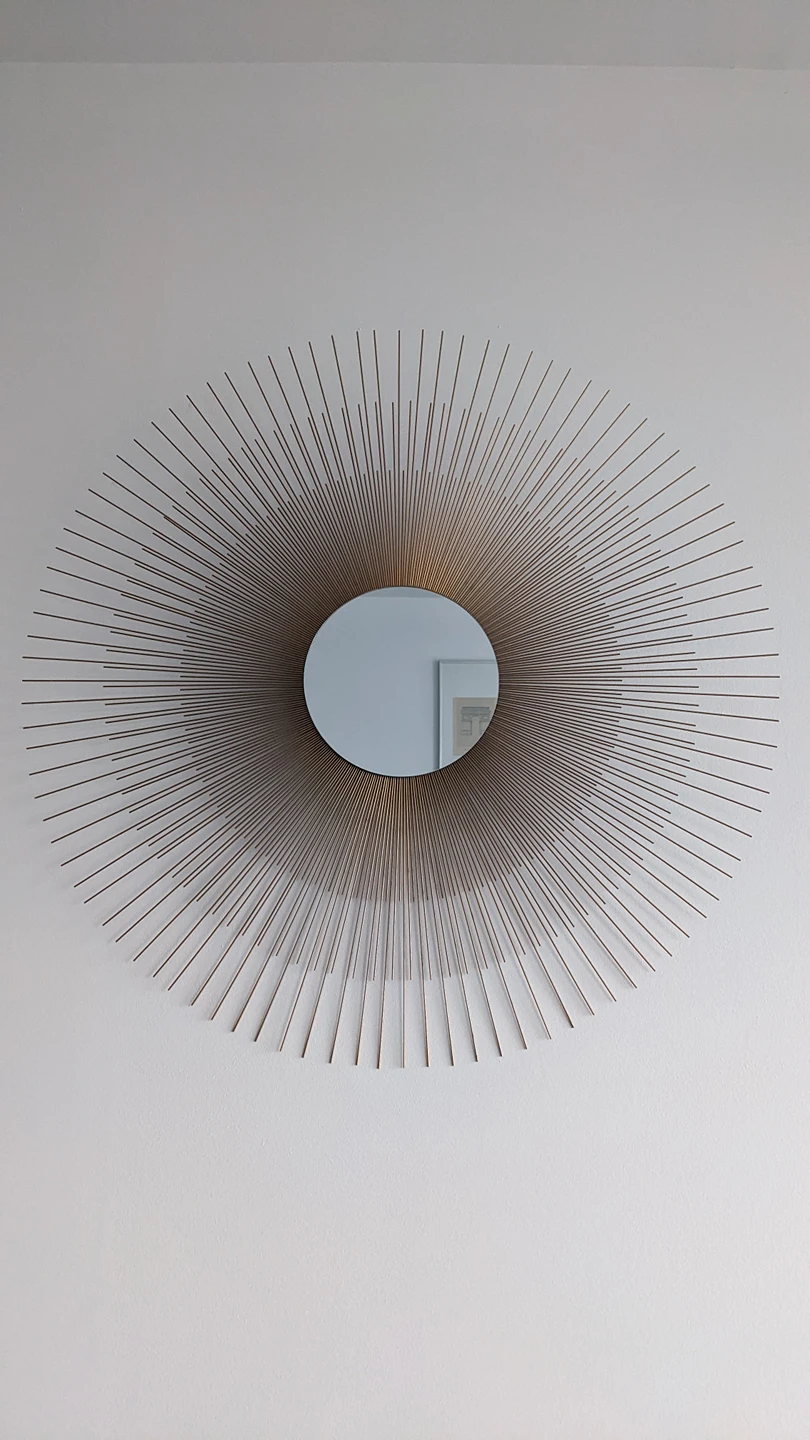 Gold/copper metal sunburst mirror. Great size! 29" in diameter, mirror itself 8" in diameter. Pick up only.
