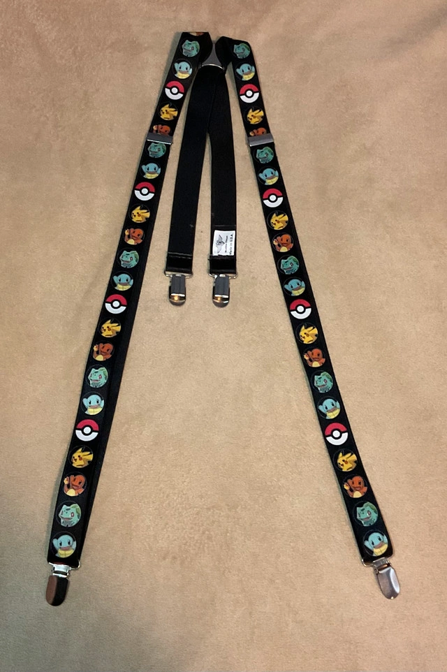Pokemon starter pokeball Buckle-Down suspenders. I originally bout them from Spencer’s a few years ago, but now I have no interest in wearing them anymore. I’m looking to get $10 cash for them. They’re in great condition, no lose threads, no rips, clamps are clean and work fine. Message if more photos are needed. Door pickup please. Thanks.