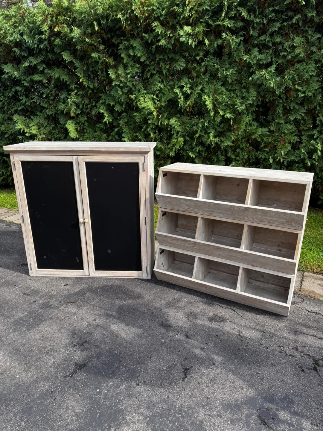 RESTORATION HARDWARE BABY & CHILD Selling a wooden cabinet with black doors and a matching storage shelf. Both pieces are in good condition and would be great for organizing any space!