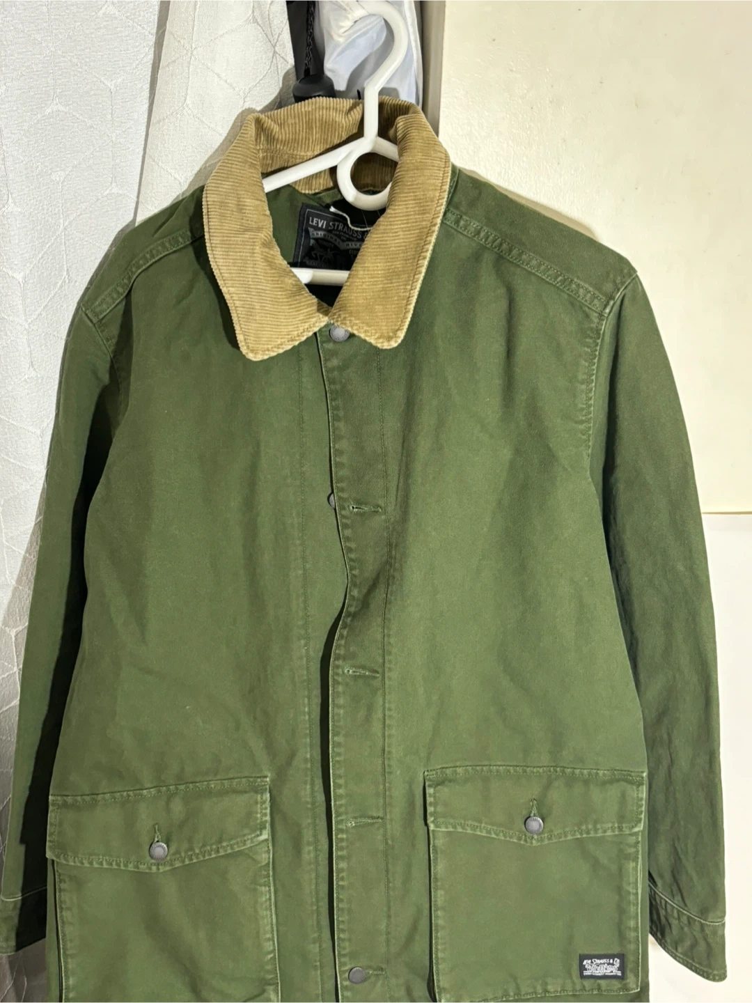 Levi Trench Coat Size medium on the tag but I think large would fit too. Additional specifications include: * Durable fabric * Button-up closure * Multiple pockets * Corduroy collar I don’t wear it and I need space, trades are open Message me if interested