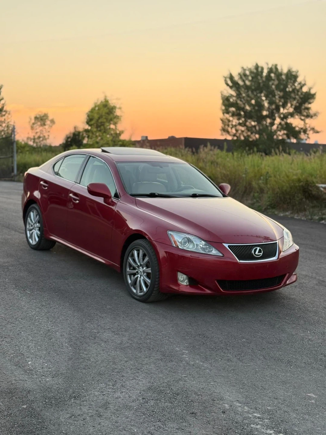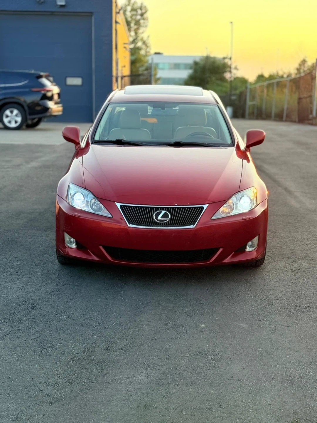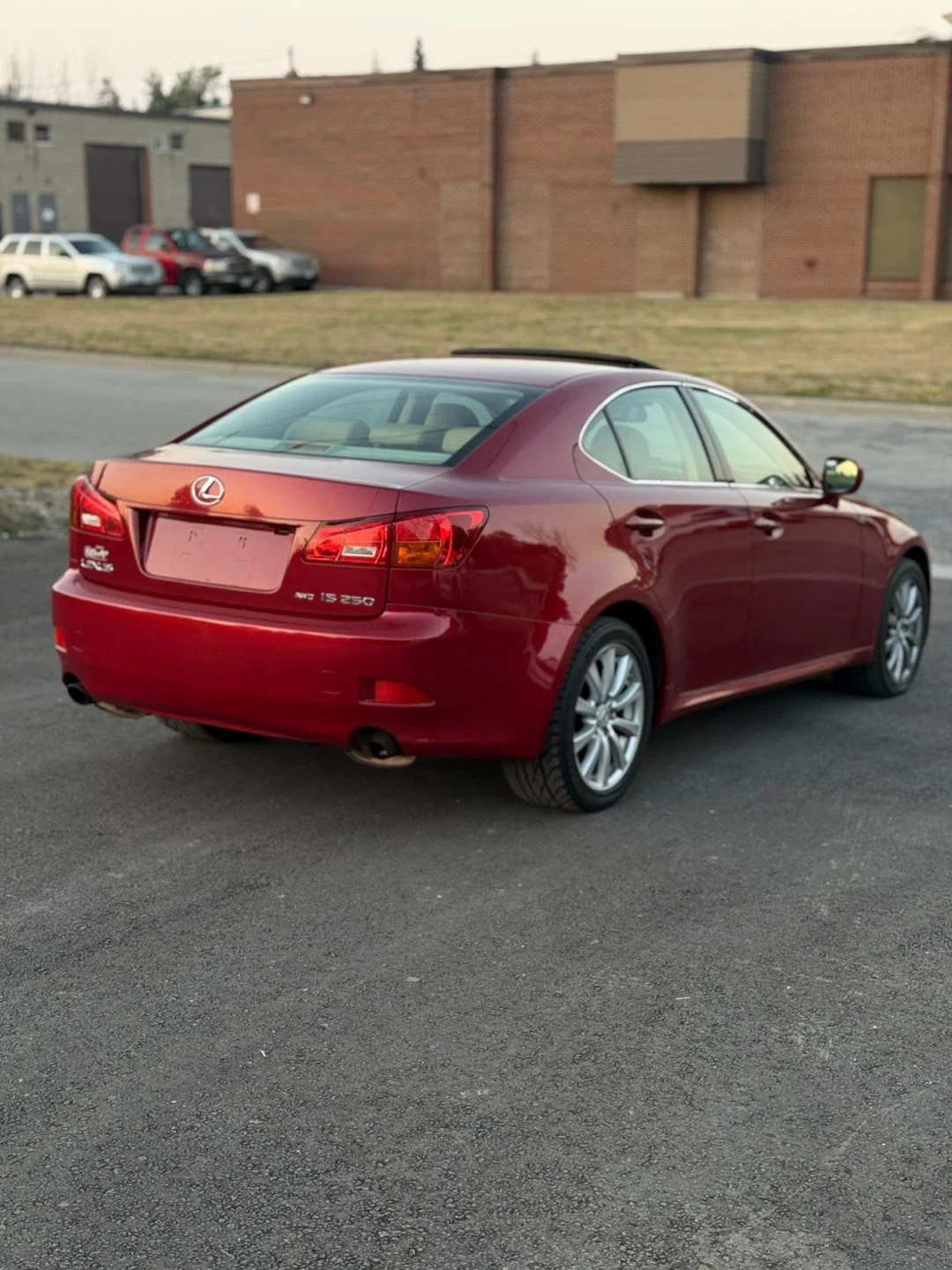 Selling a red Lexus IS 250 sedan. It looks to be in good condition. The interior is a beige colour, and the car has a sunroof. Feel free to reach out if you have any questions!