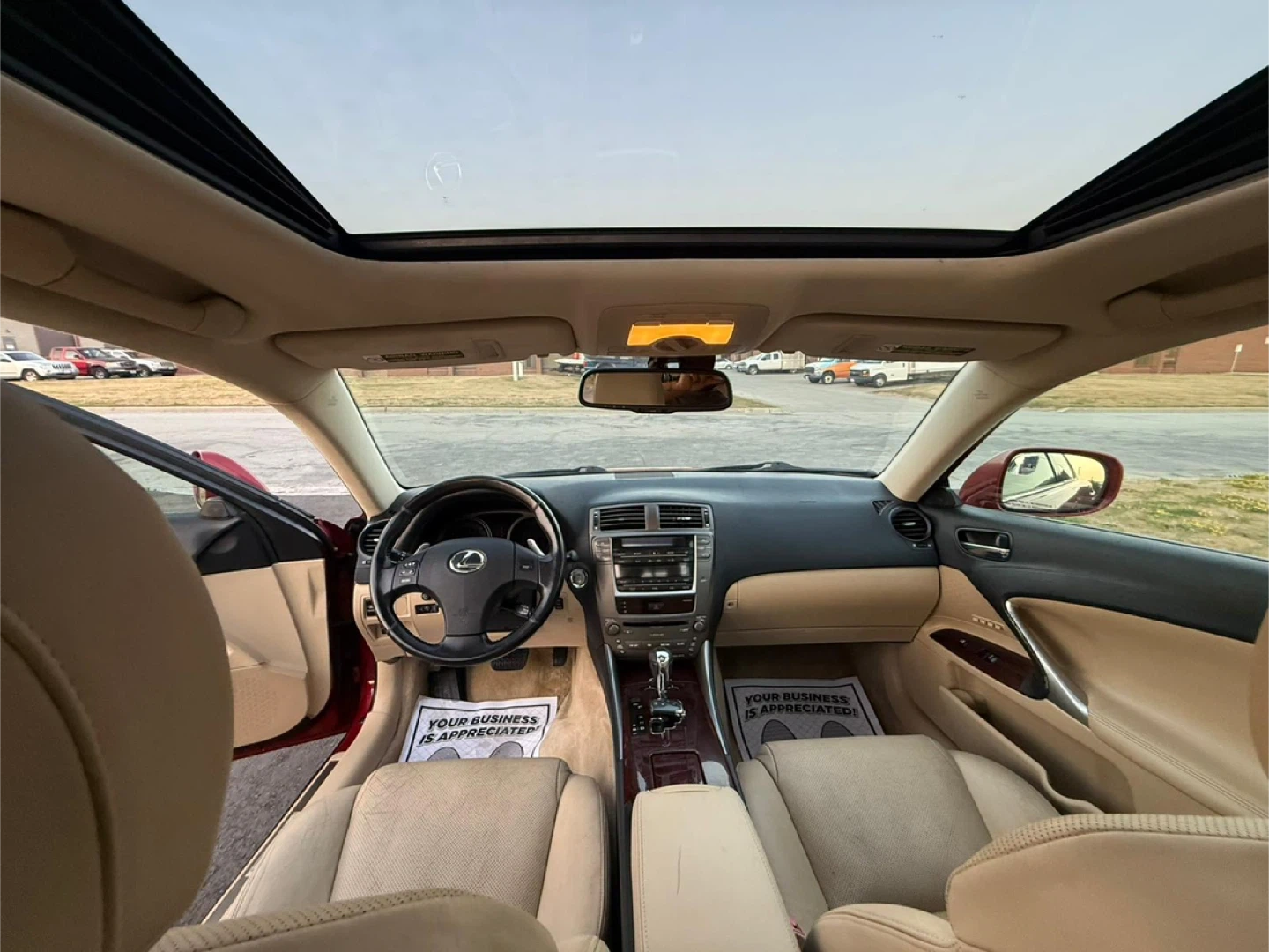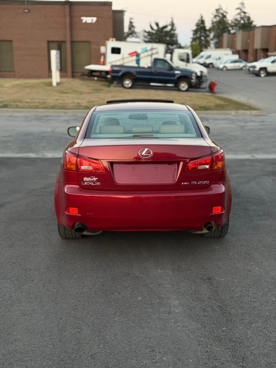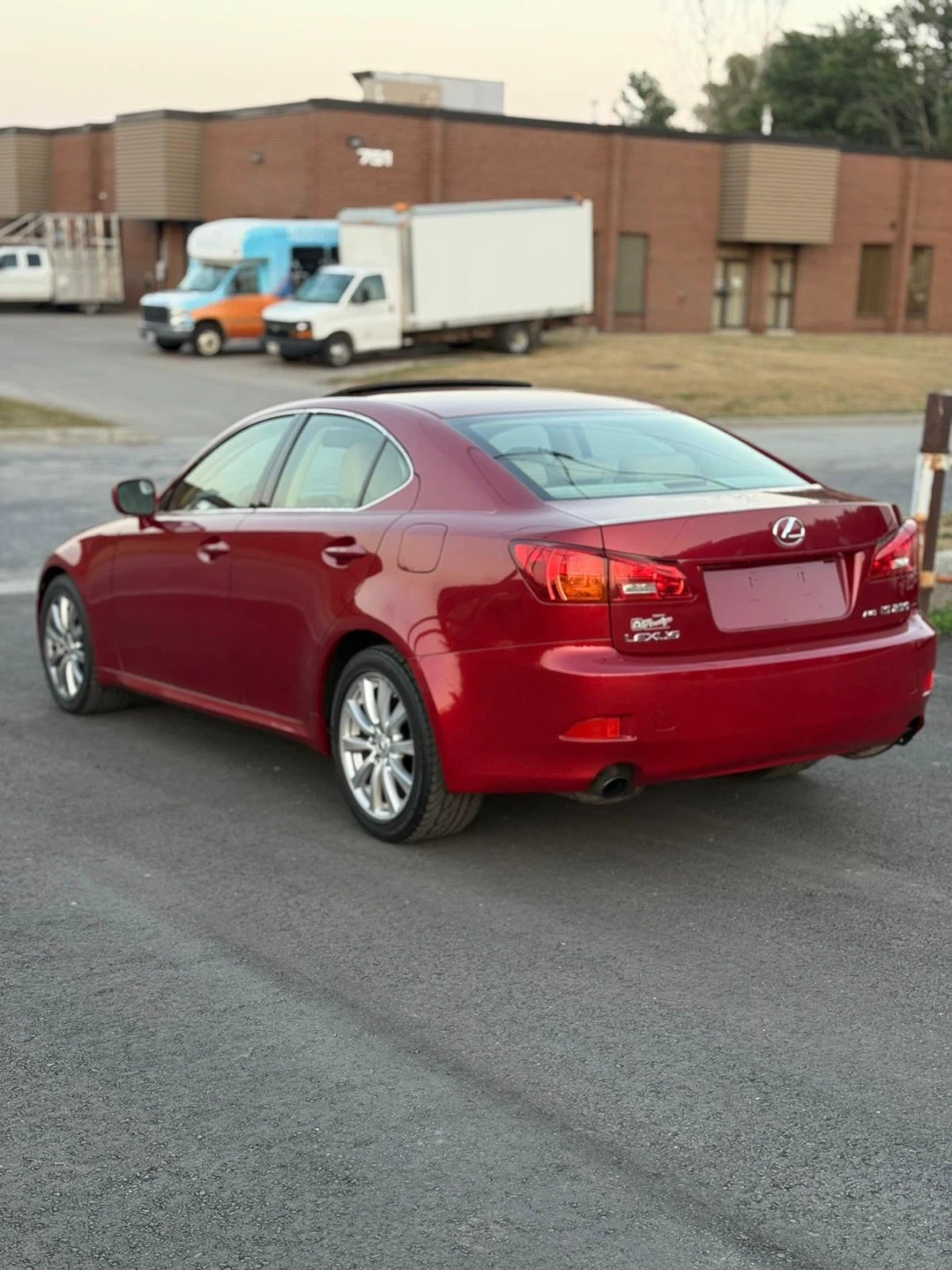 Selling a red Lexus IS 250 sedan. It looks to be in good condition. The interior is a beige colour, and the car has a sunroof. Feel free to reach out if you have any questions!