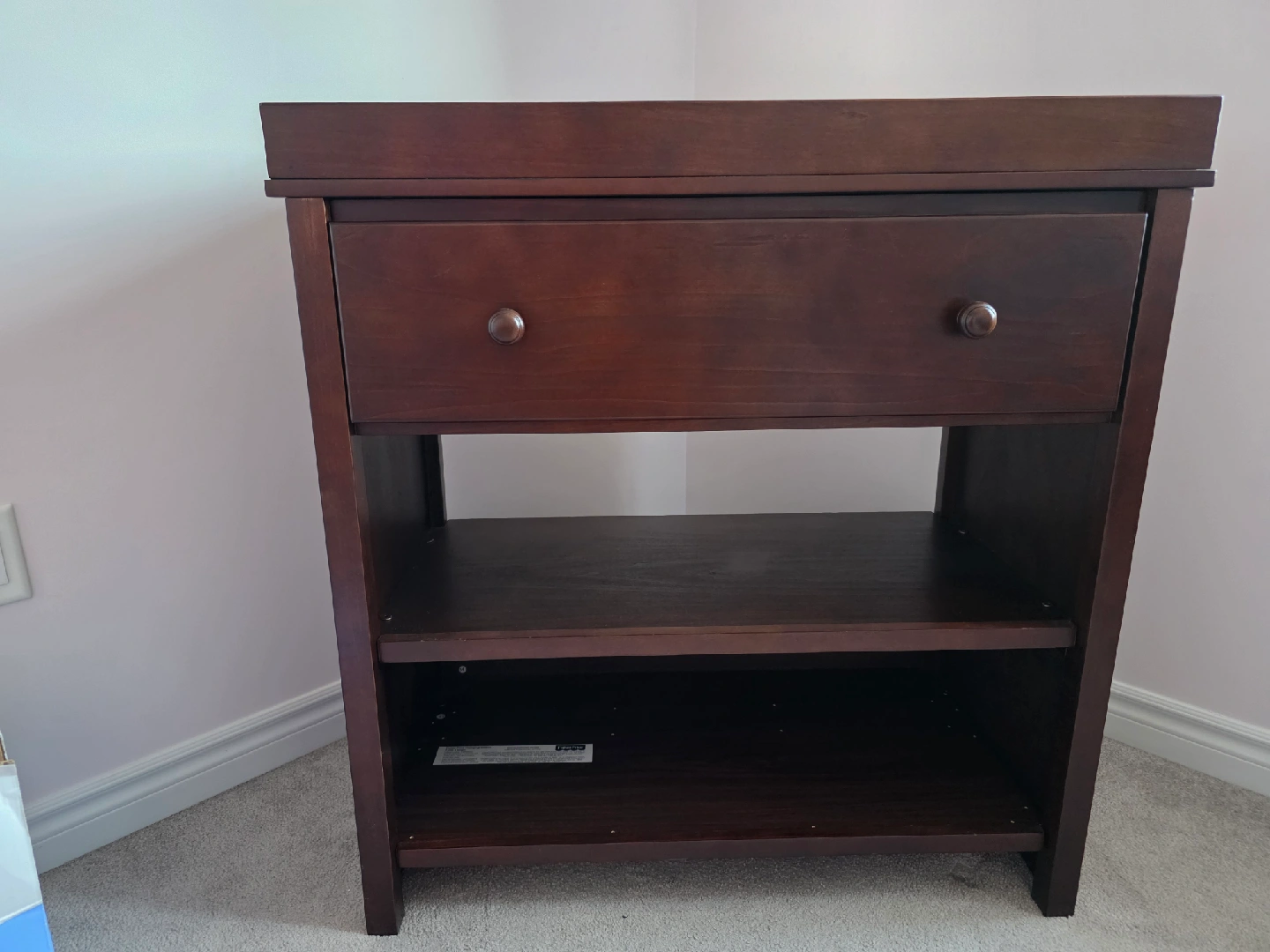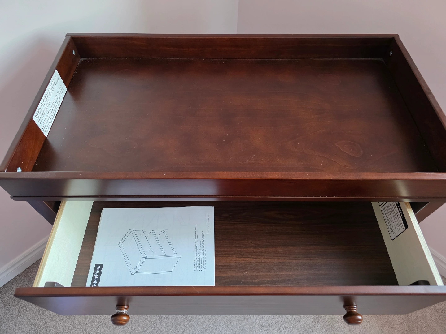 Here's a Fisher Price changing table in a lovely dark brown finish. It features a drawer and two shelves for storage. Perfect for keeping baby essentials organized and within reach!