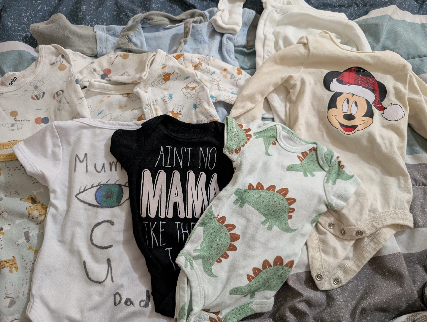 A cute collection of baby onesies! There's a variety of designs, including Mickey Mouse, dinosaurs, and other fun prints. Perfect for your little one!