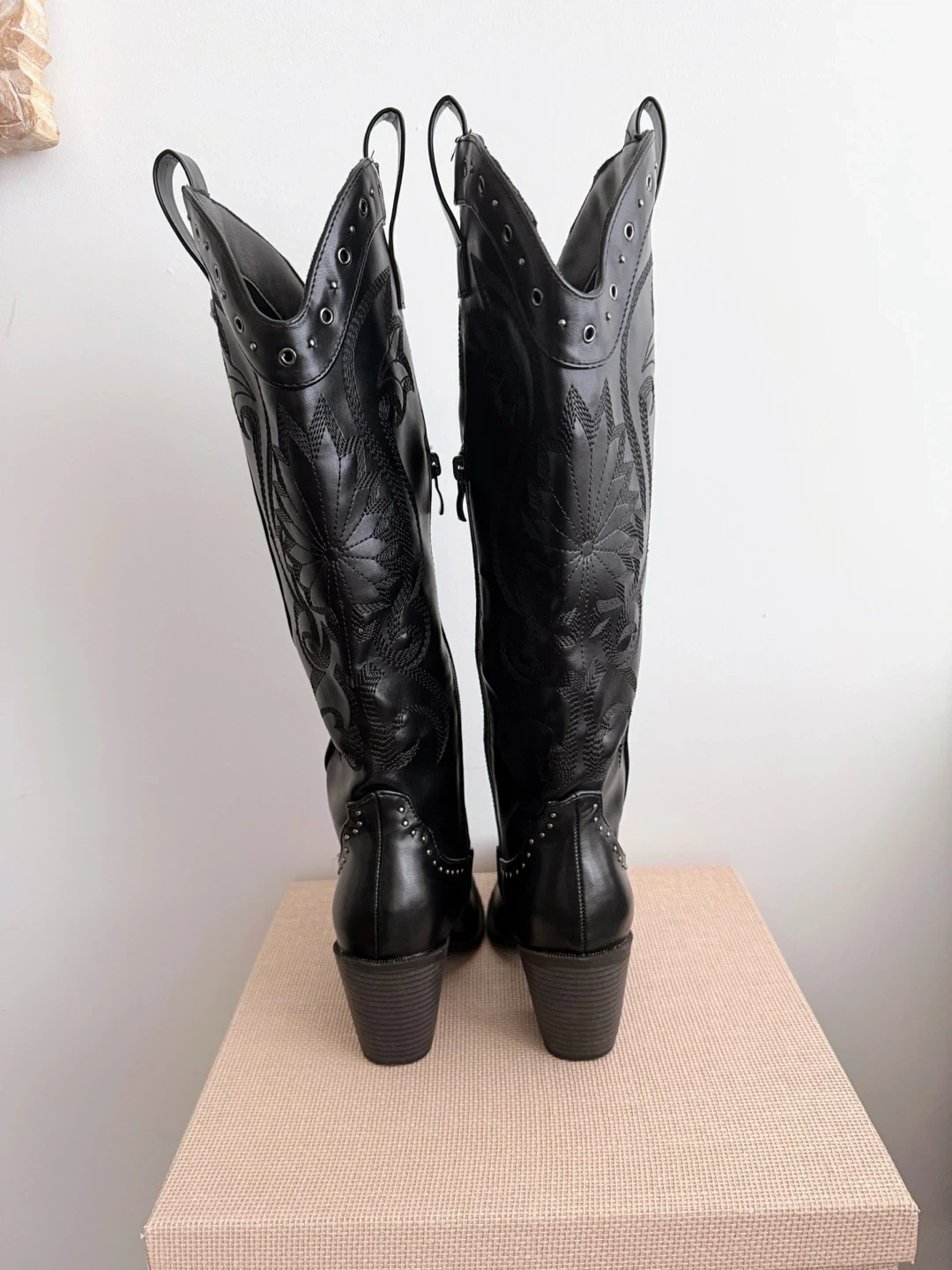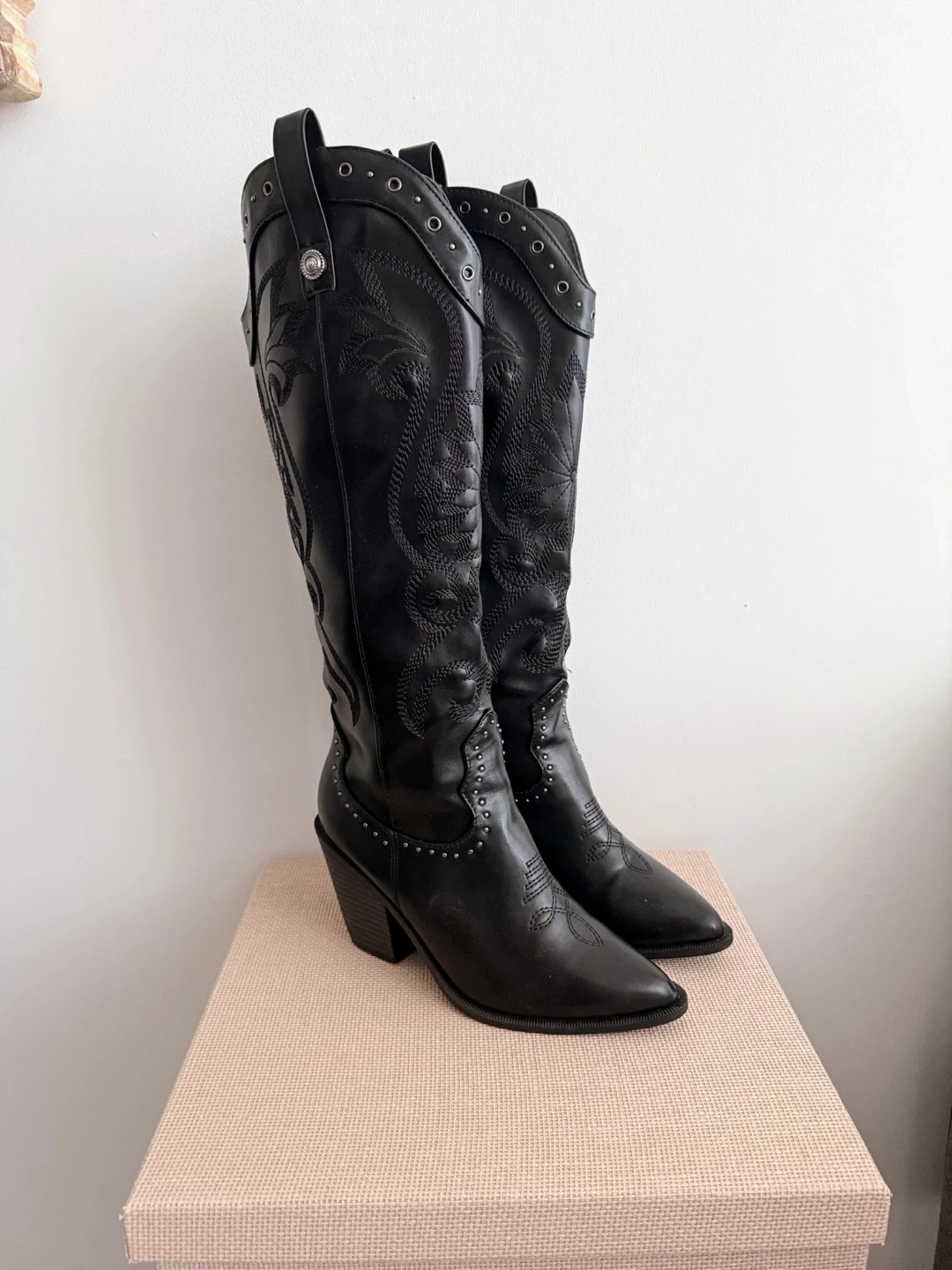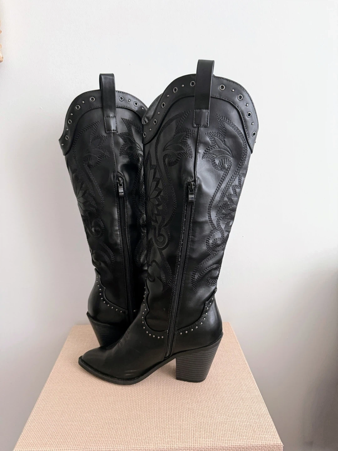 Black faux leather cowboy boots Black detailed and silver stud details Super comfortable and stylish