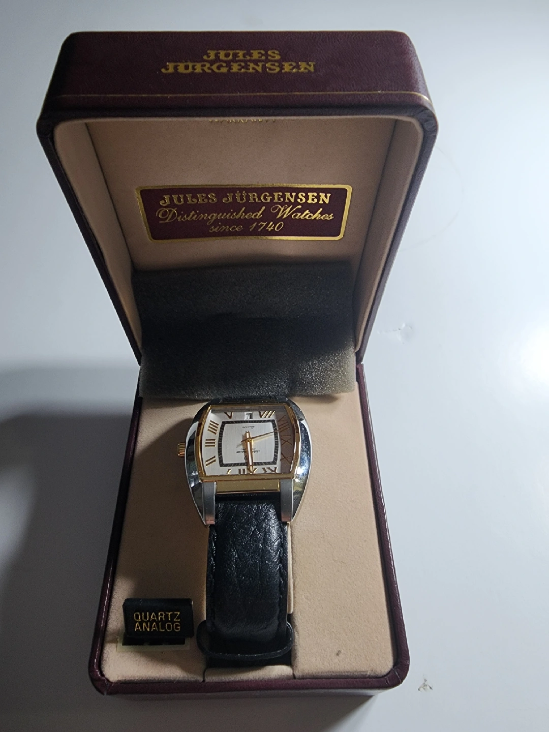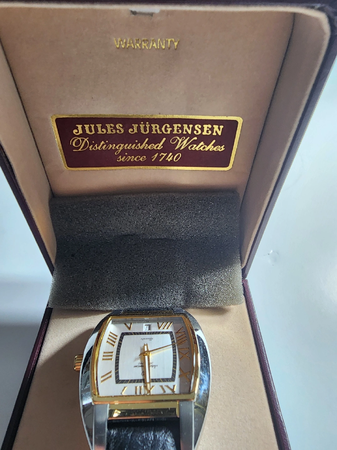 Selling a Jules Jürgensen watch. It comes with its original box, making it a great find for collectors or anyone who appreciates a classic timepiece! The watch is brand new still in original packaging but it needs a new battery