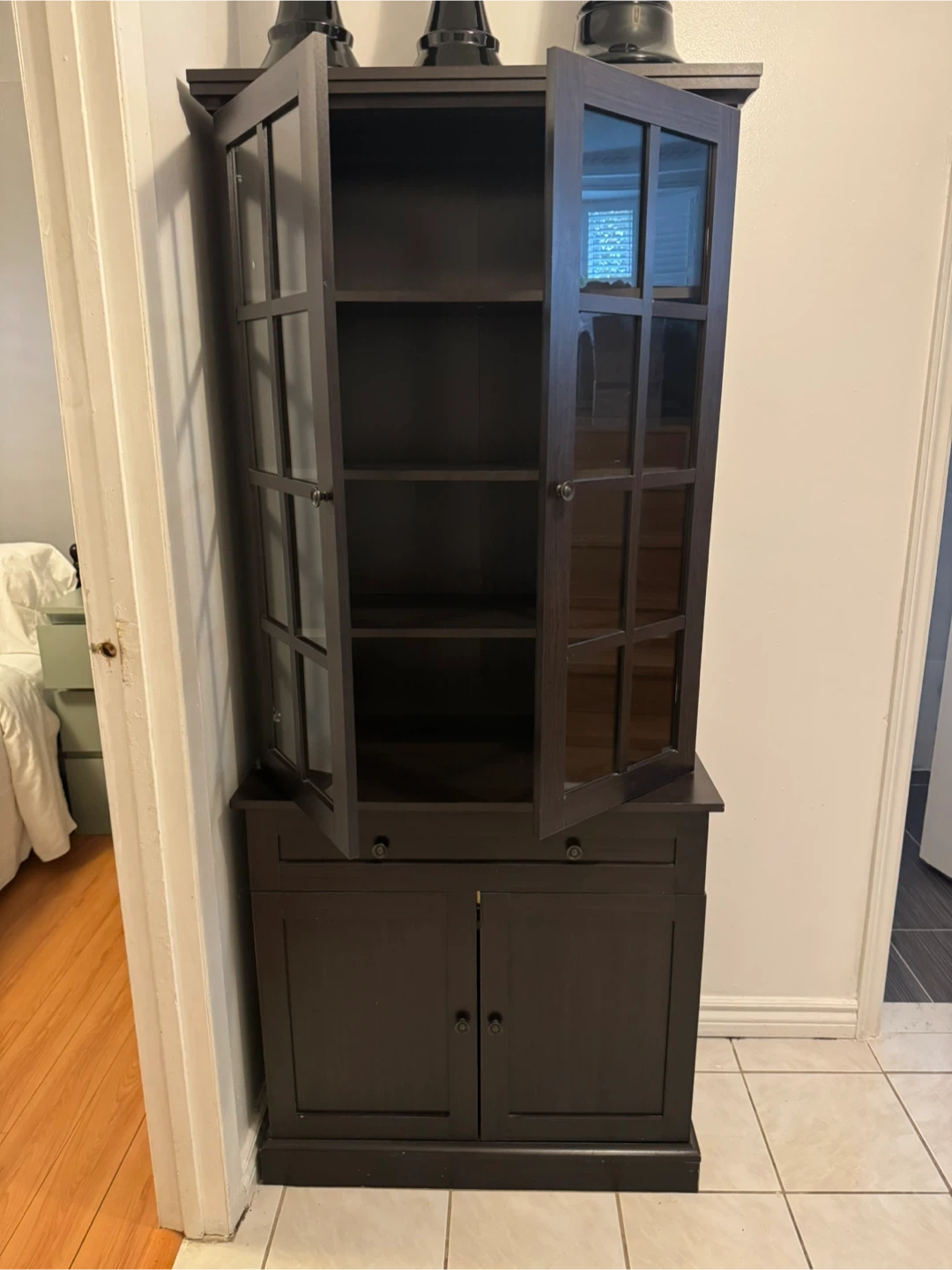 Selling a dark brown display cabinet with glass doors. It has shelving inside the upper portion and a cabinet below for extra storage. It's in good condition and would be a great addition to any living room or dining room