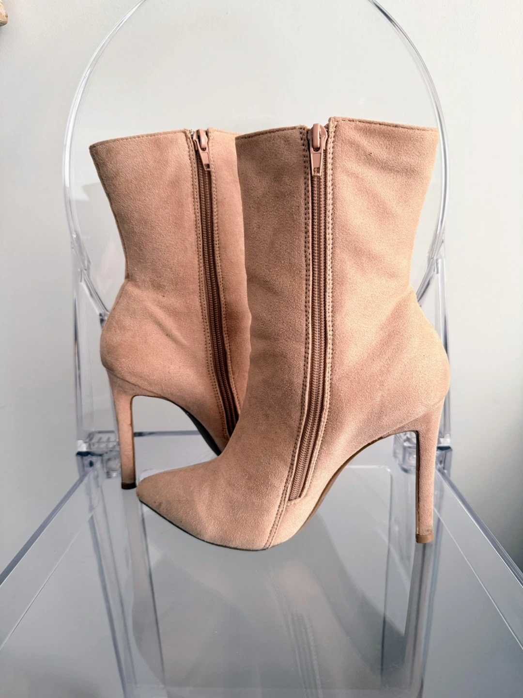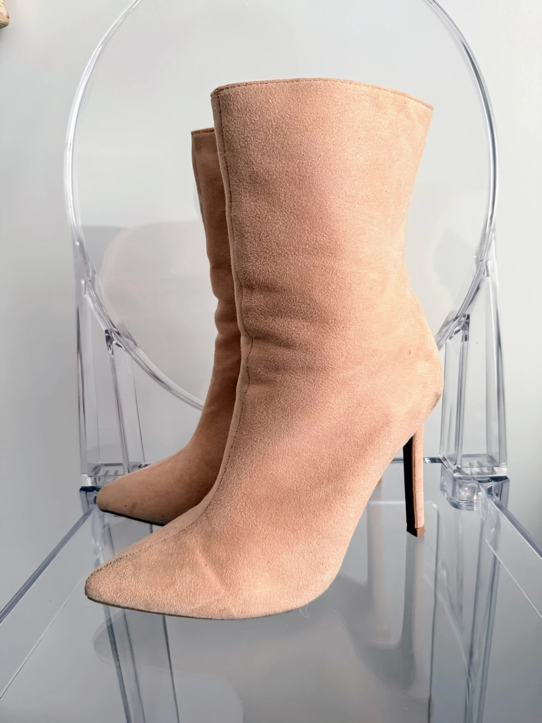 Light beige faux suede boots Mid to lower calf length Super sexy stiletto heels and pointed toe Inner zipper