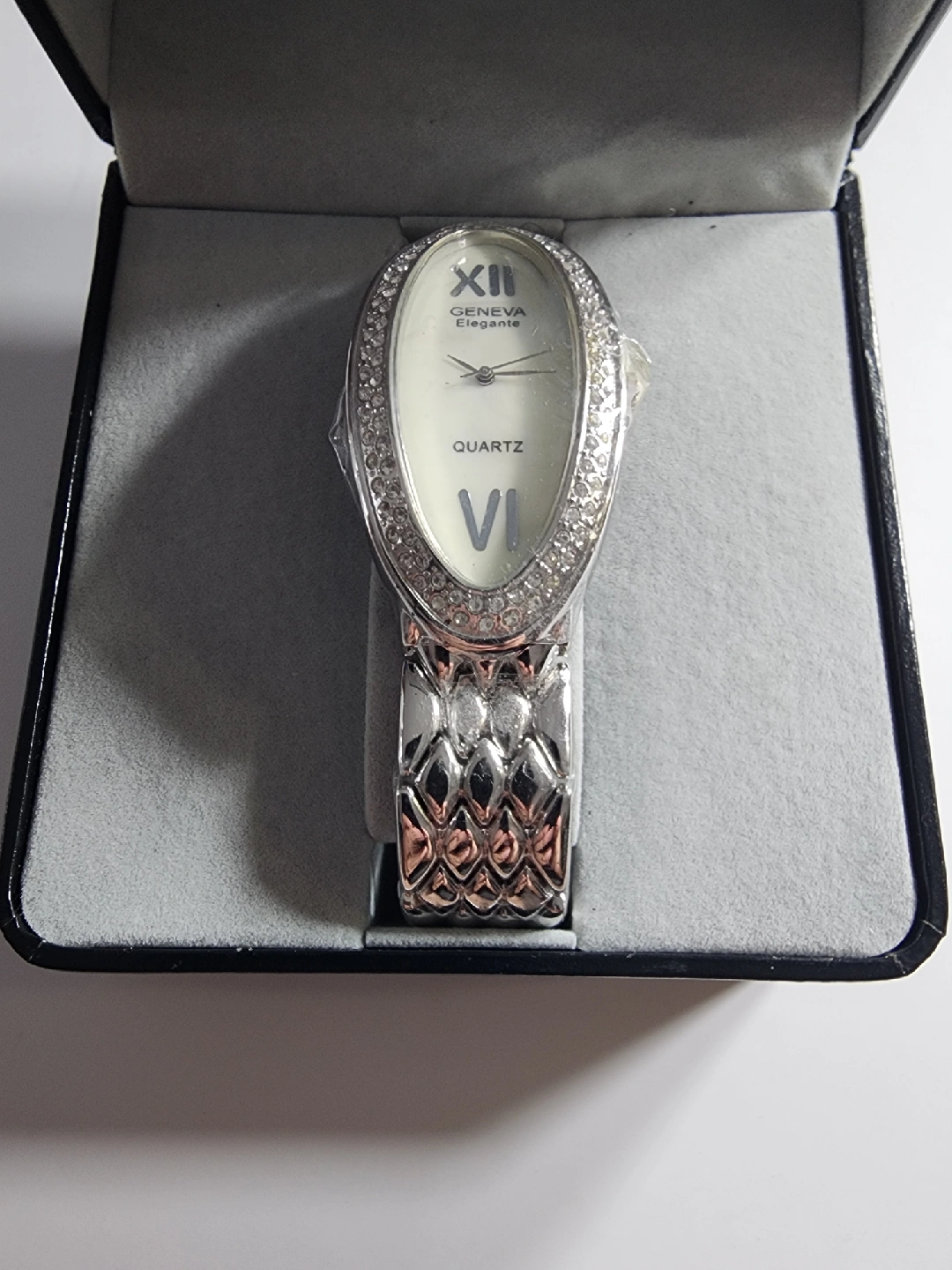 Selling a Geneva Elegante quartz watch! It comes in its original box and features a silver-tone band and a sparkly bezel around the oval face. The watch face has Roman numerals at the 12 and 6 o'clock positions. It's in great condition and ready for a new home!