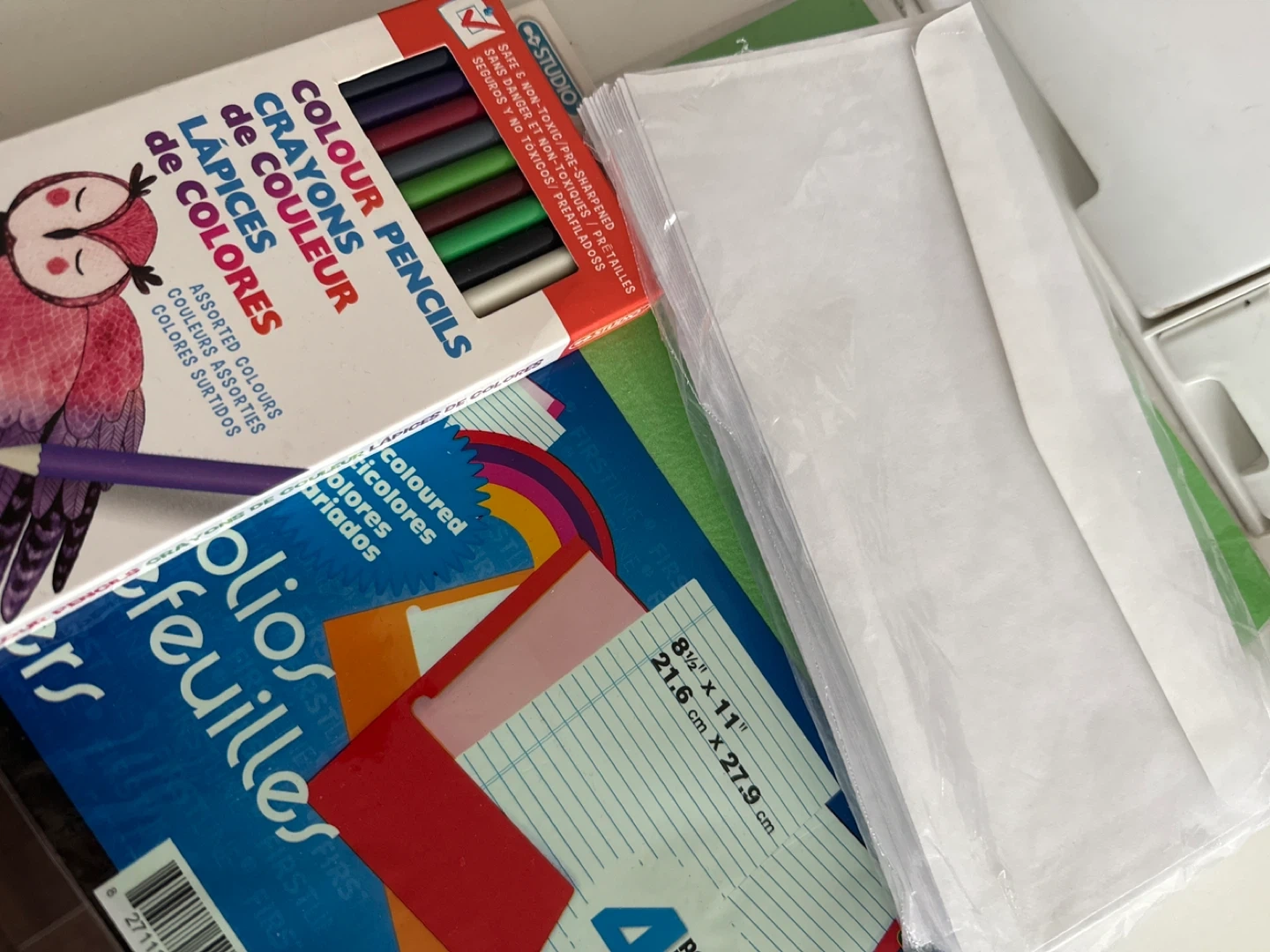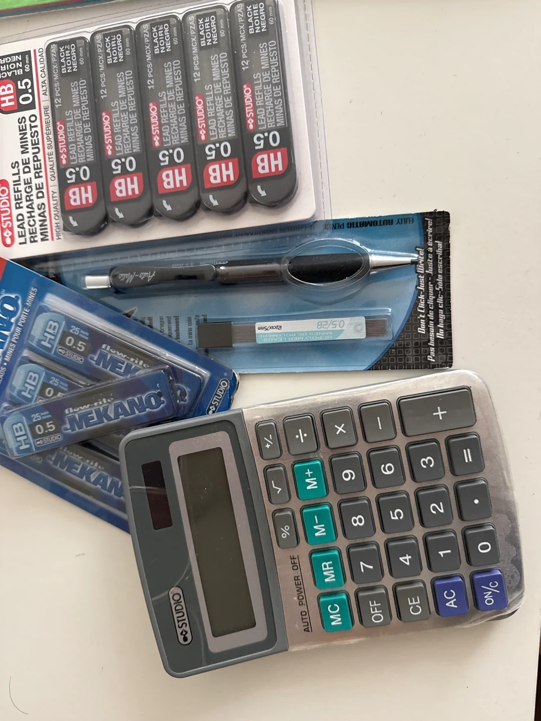 Selling a collection of school and office supplies. Includes a Studio calculator, lead refills, mechanical pencil, colour pencils, and portfolio folders. All in good condition and ready for a new home