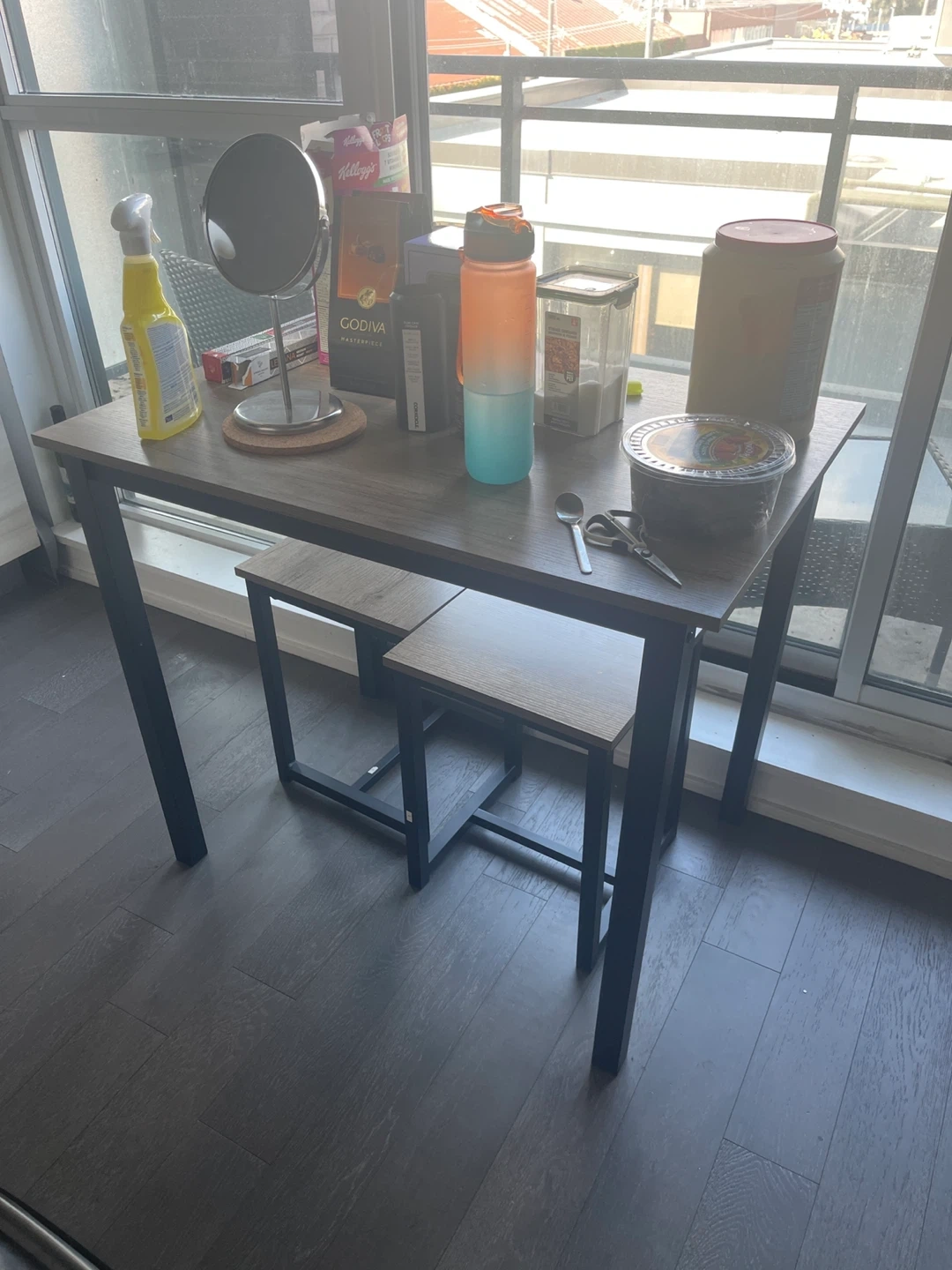 Selling a dining table that comes with two matching stools. It's in great shape and perfect for a small space! The table has a nice wood-look top and sturdy black metal legs. Would be great for a kitchen or apartment