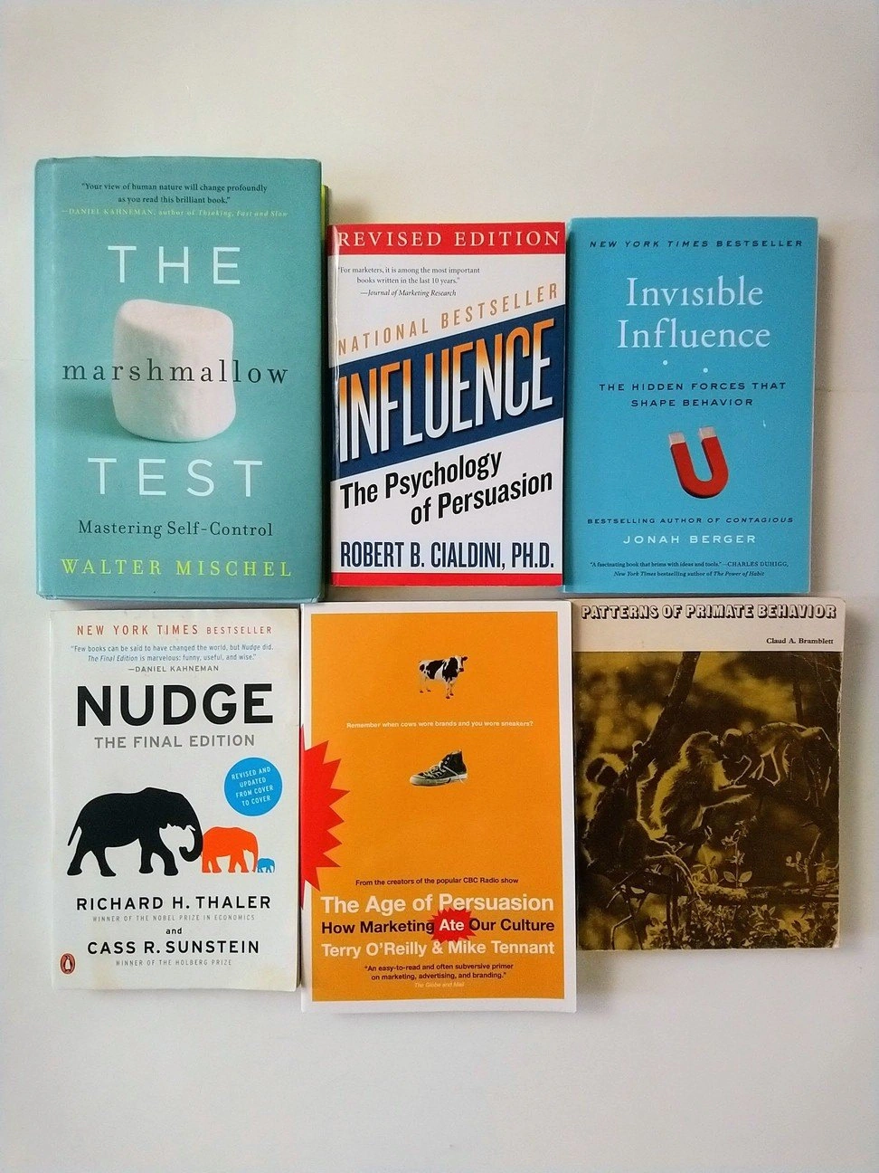 Location: Yonge and College /downtown Toronto $7 each except Influence. Cash only; prices are firm. - The Marshmallow Test: Mastering Self-Control - Walter Mischel - Influence: The Psychology of Persuasion - Robert B. Cialdini - $8 - Invisible Influence: The Hidden Forces That Shape Behavior - Jonah Berger - Nudge - Richard H. Thaler & Cass R. Sunstein - The Age of Persuasion: How Marketing Ate Our Culture - Terry O'Reilly & Mike Tennant - Patterns of Primate Behavior - Claud A. Bramblett Feel free to check out my other book posts as well!