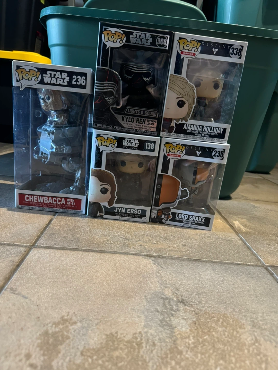 Selling a collection of Funko POP! figures. Included are: - Star Wars Chewbacca with AT-ST (236) - Star Wars Kylo Ren Lights & Sound (308) - Destiny Amanda Holliday (338) - Rogue One Jyn Erso (138) - Destiny Lord Shaxx (235) take all for $100