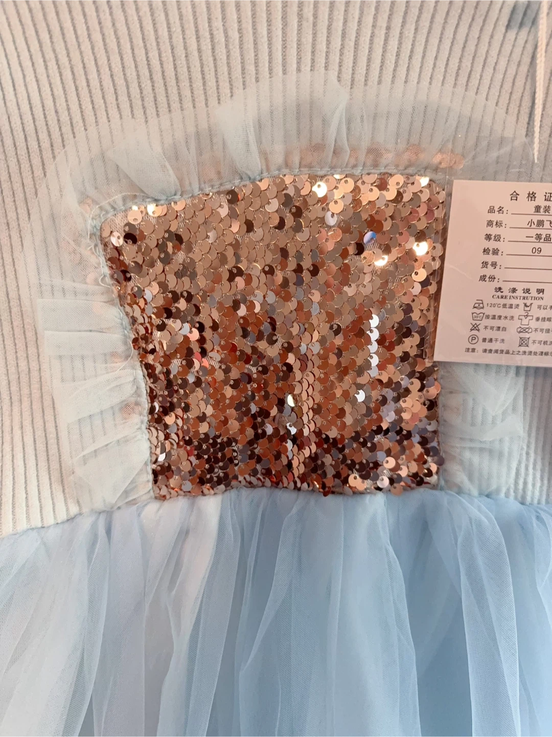 A beautiful girls' dress in a lovely shade of blue! It features long sleeves, a sequin detail on the bodice, and a tulle skirt with a cute princess print at the bottom. Perfect for your little princess!