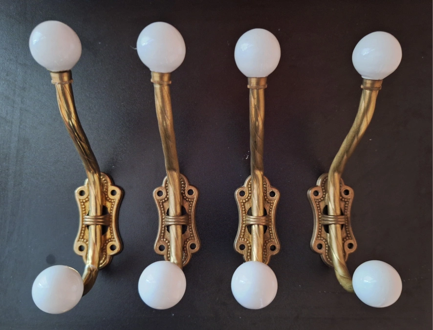 Selling a set of four vintage coat hooks. Brass with ceramic. Made in Taiwan