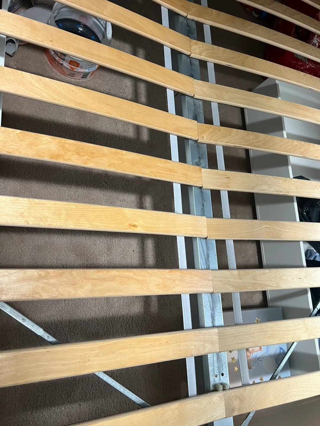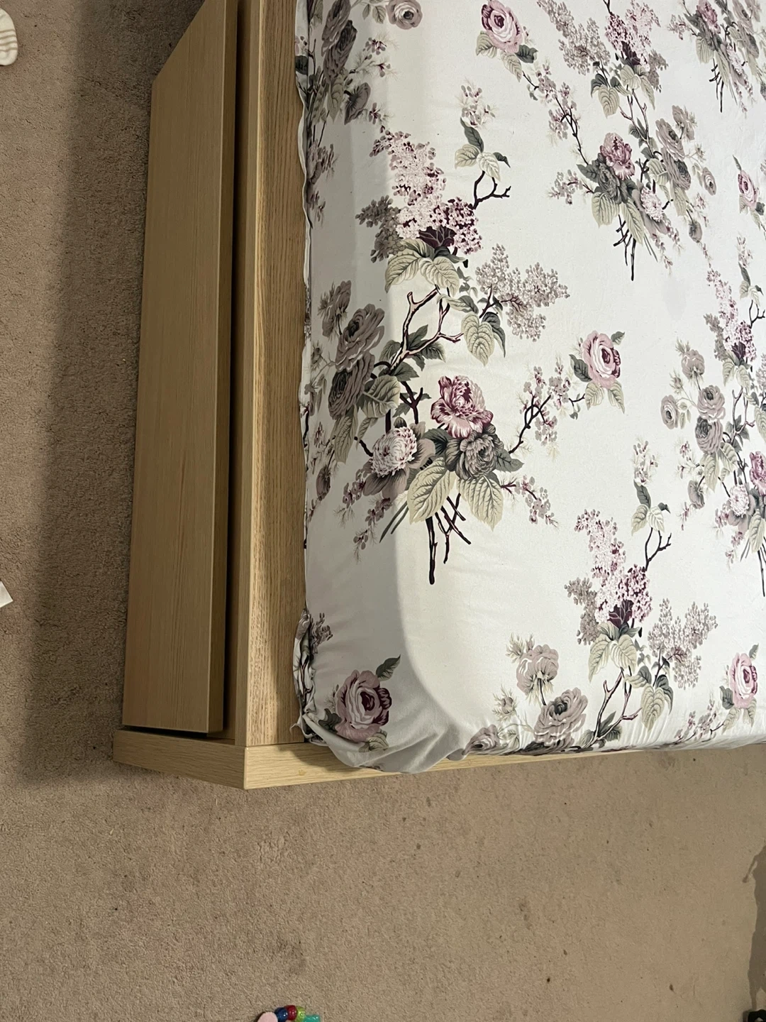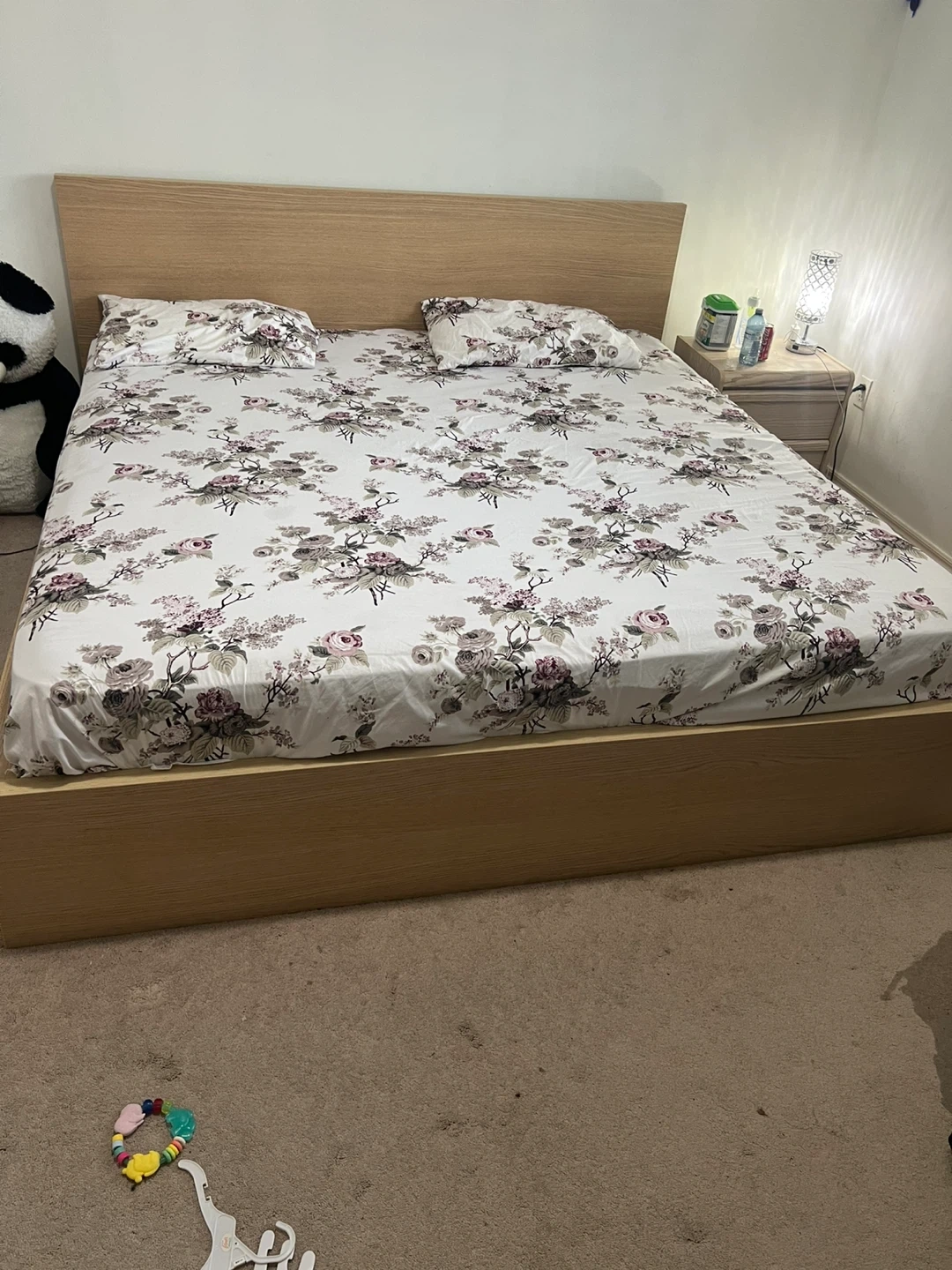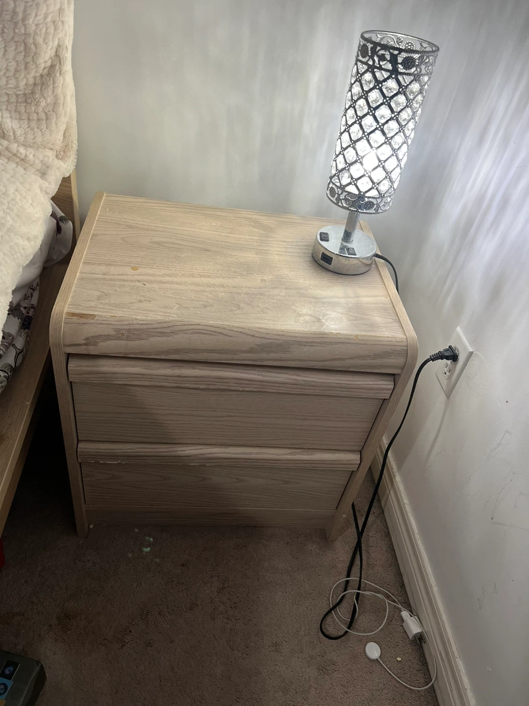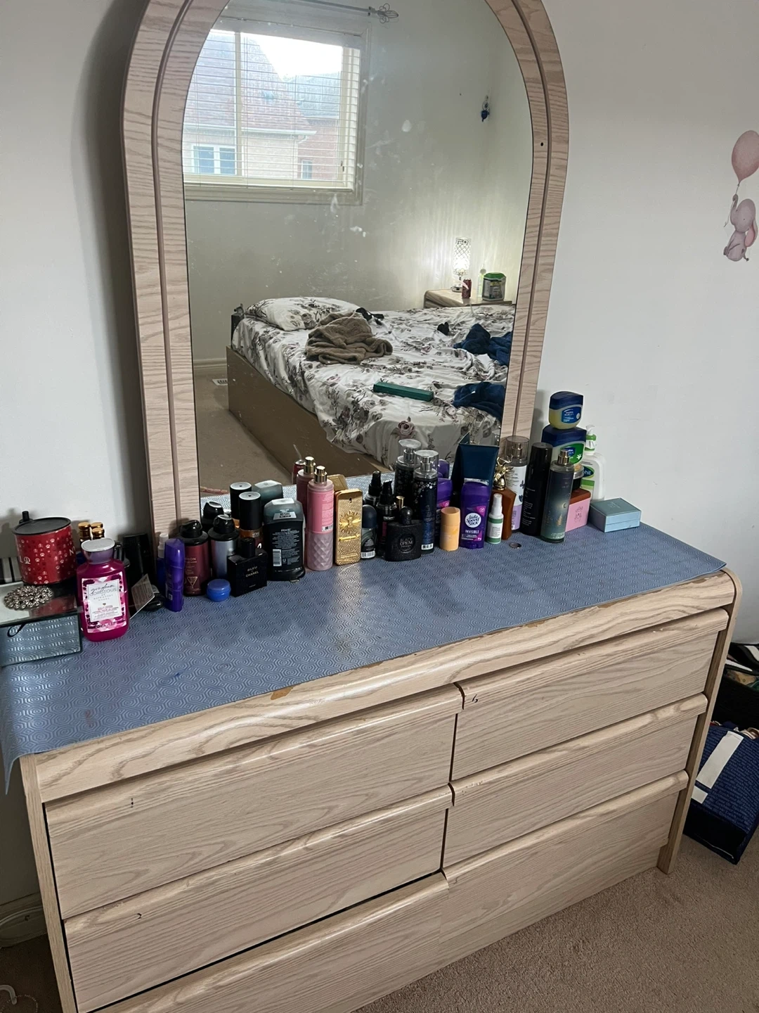 Selling a bedroom set that includes a bed frame, a dresser with a mirror, and a nightstand. All items are in good condition and have a light wood finish. Perfect for furnishing a bedroom!