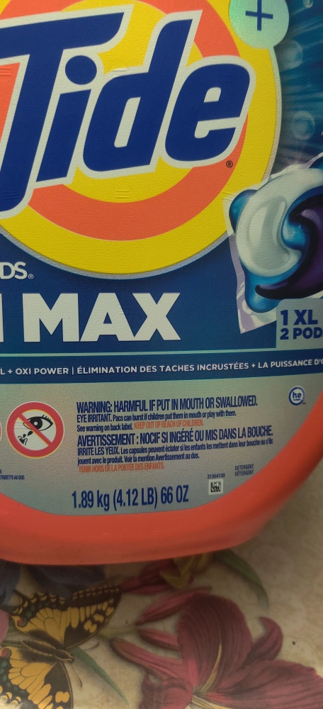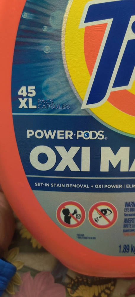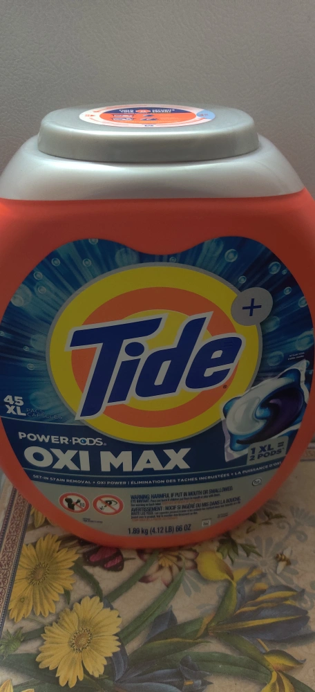 Selling a container of Tide Power Pods OXI MAX, containing 45 XL pacs. It's the perfect solution for set-in stain removal and OXI power! The container weighs 1.89 kg (4.12 LB) 66 OZ