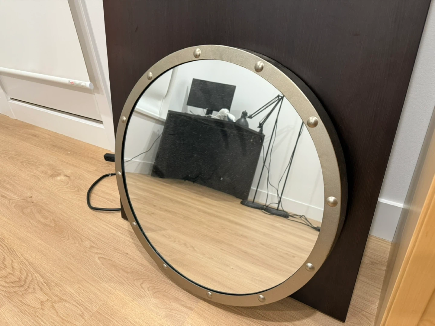 Selling a stylish round wall mirror. It has a silver-coloured frame with studded detailing. Great for adding a touch of industrial chic to any room!