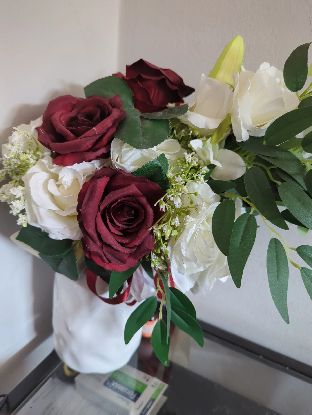 Selling a beautiful artificial flower bouquet featuring burgundy and white roses with greenery. It's in great condition and perfect for adding a touch of elegance to any room or event