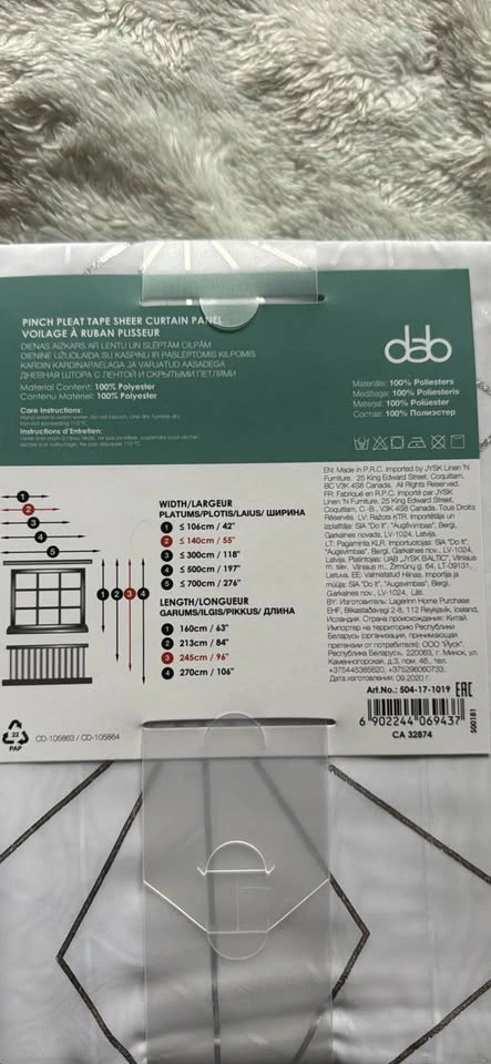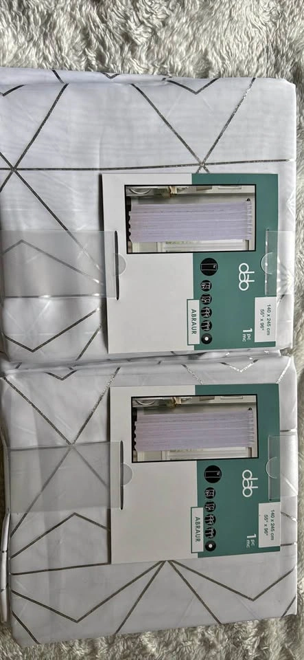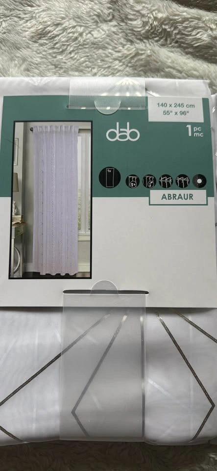 2 x Curtain Panels - Sheer white w/ silver modern geometric pattern. Brand new. Listed price includes both. 55” x 96” (140 x 245 cm)