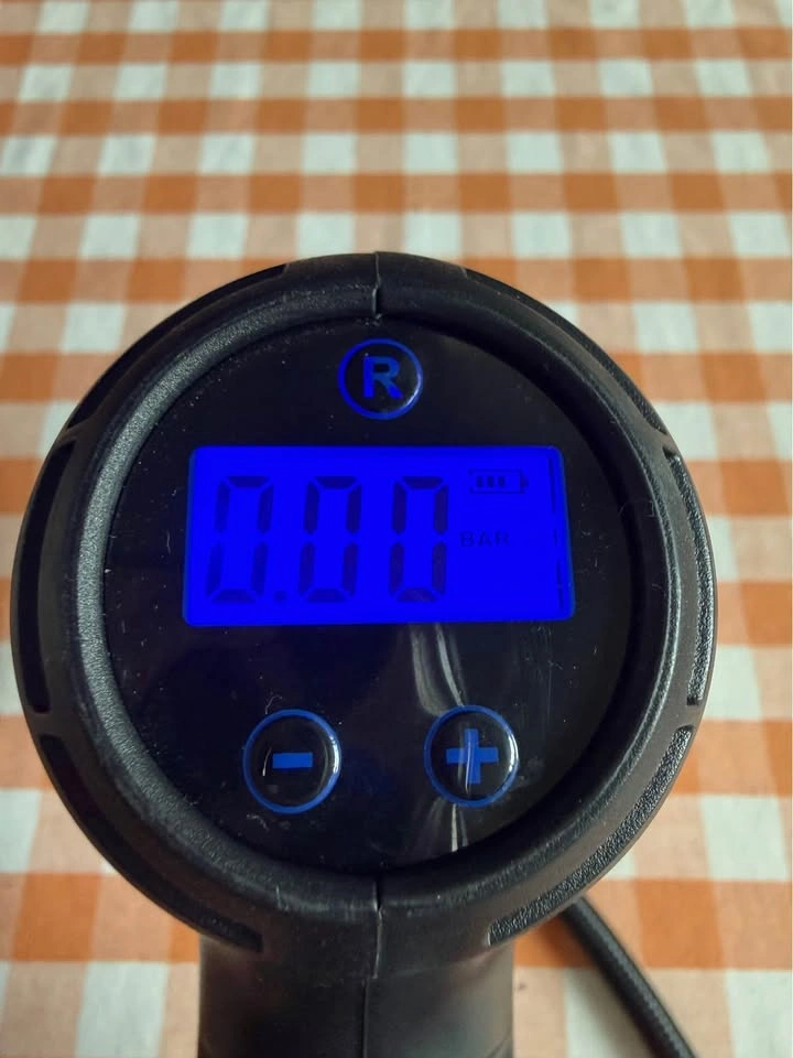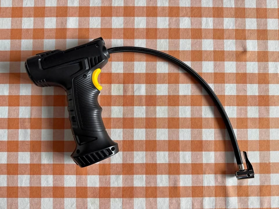 Ergonomic handle with a yellow trigger — this is used to start or stop the airflow. Flexible hose with a metal clamp head — this attaches to the tire valve (for a car, bicycle, scooter, etc.). Digital pressure display or built-in LED light on the front (4 modes visible in attached photos).