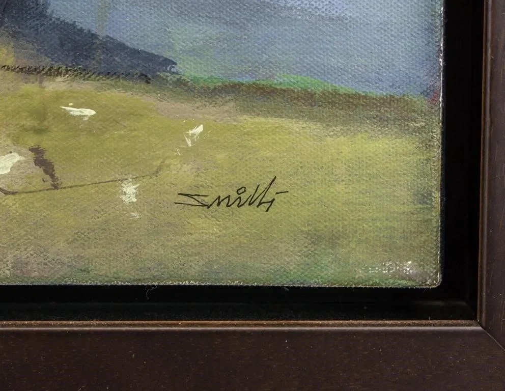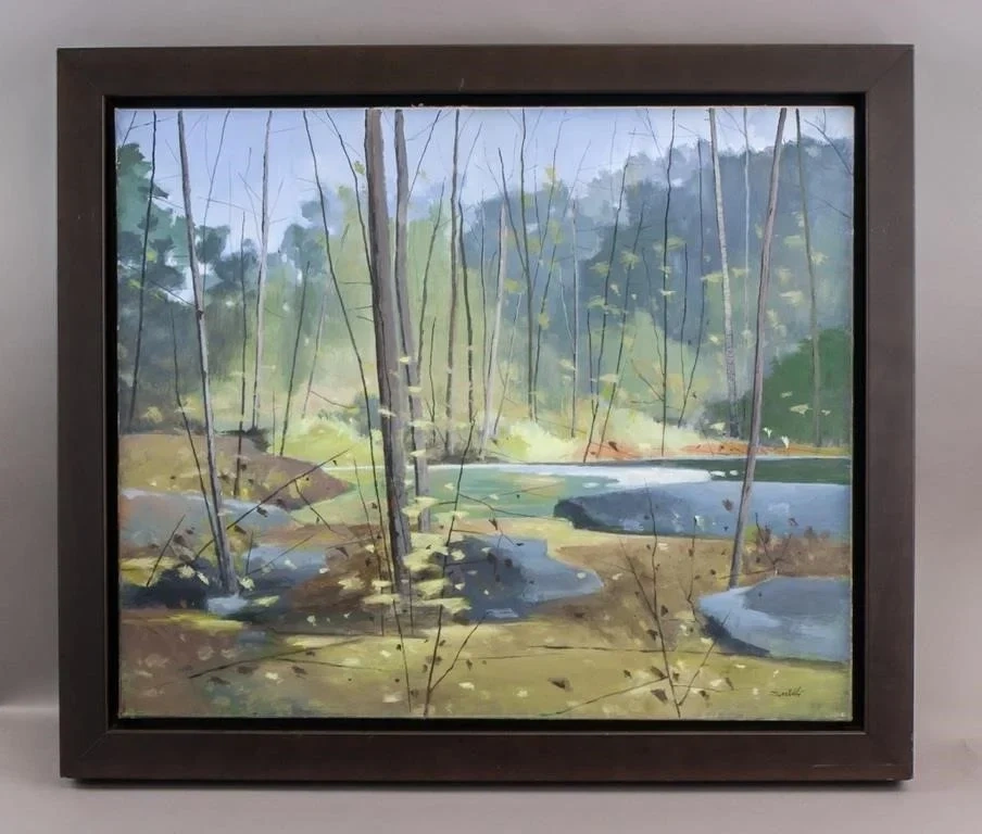 Acrylic on Canvas, framed. Donald Appelbe Smith (1917 - ). This painting captures a serene forest scene with tall, slender trees and a tranquil pond reflecting the surrounding greenery. The artist’s use of light and shadow creates a sense of depth and tranquility. Signed Smith on bottom right corner. 'Donald A Smith' inscribed on verso dated 98. COA by Harbour Gallery dated 2015 included. 53 cm x 62 cm (21" x 24 1/2"), F: 63 cm x 71 cm (25" x 28"). Smith's works are celebrated for their ability to transport viewers into peaceful, untouched natural settings and are featured in esteemed collections at institutions such as the Harbour Gallery and other prominent galleries specializing in contemporary landscape art. Country of Origin: Canada