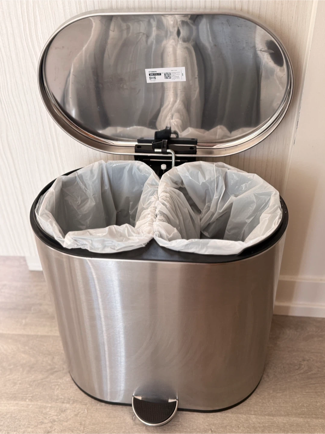 Durable metal bin with two separate compartments, perfect for sorting waste or recyclables. Compact, sturdy, and ideal for home, office, or public spaces. Available November 1st only!