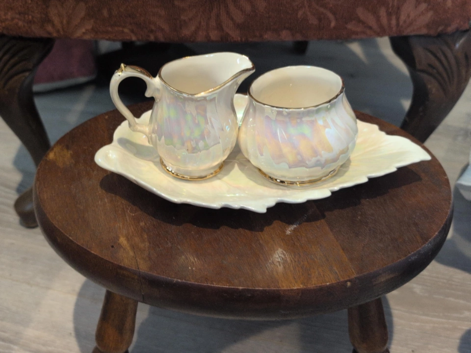 Here's a charming vintage cream and sugar set! The set includes a creamer, a sugar bowl, and a leaf-shaped tray. It has a lovely iridescent finish with gold trim. Perfect for adding a touch of elegance to your tea or coffee service