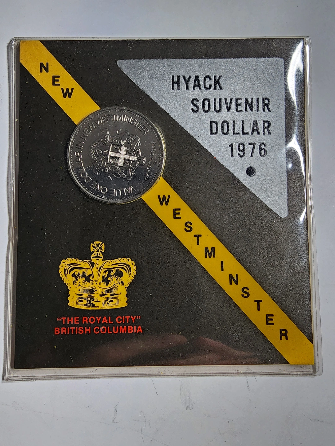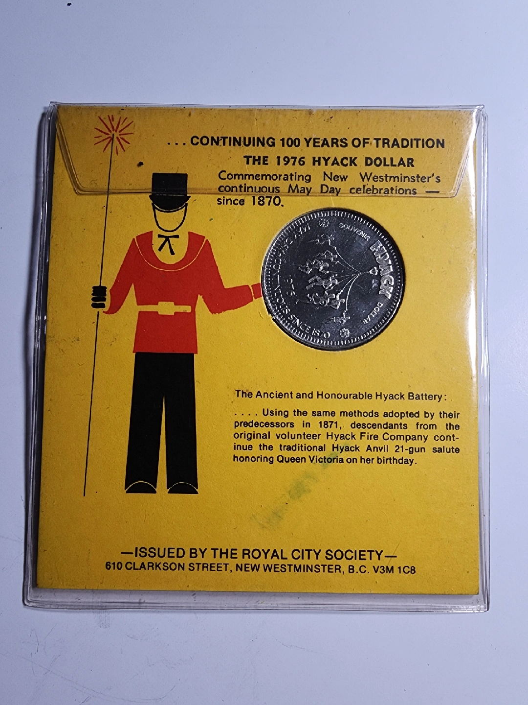 Selling a 1976 Hyack Souvenir Dollar from New Westminster! It commemorates New Westminster's continuous May Day celebrations since 1870. This coin is a piece of local history, issued by The Royal City Society.