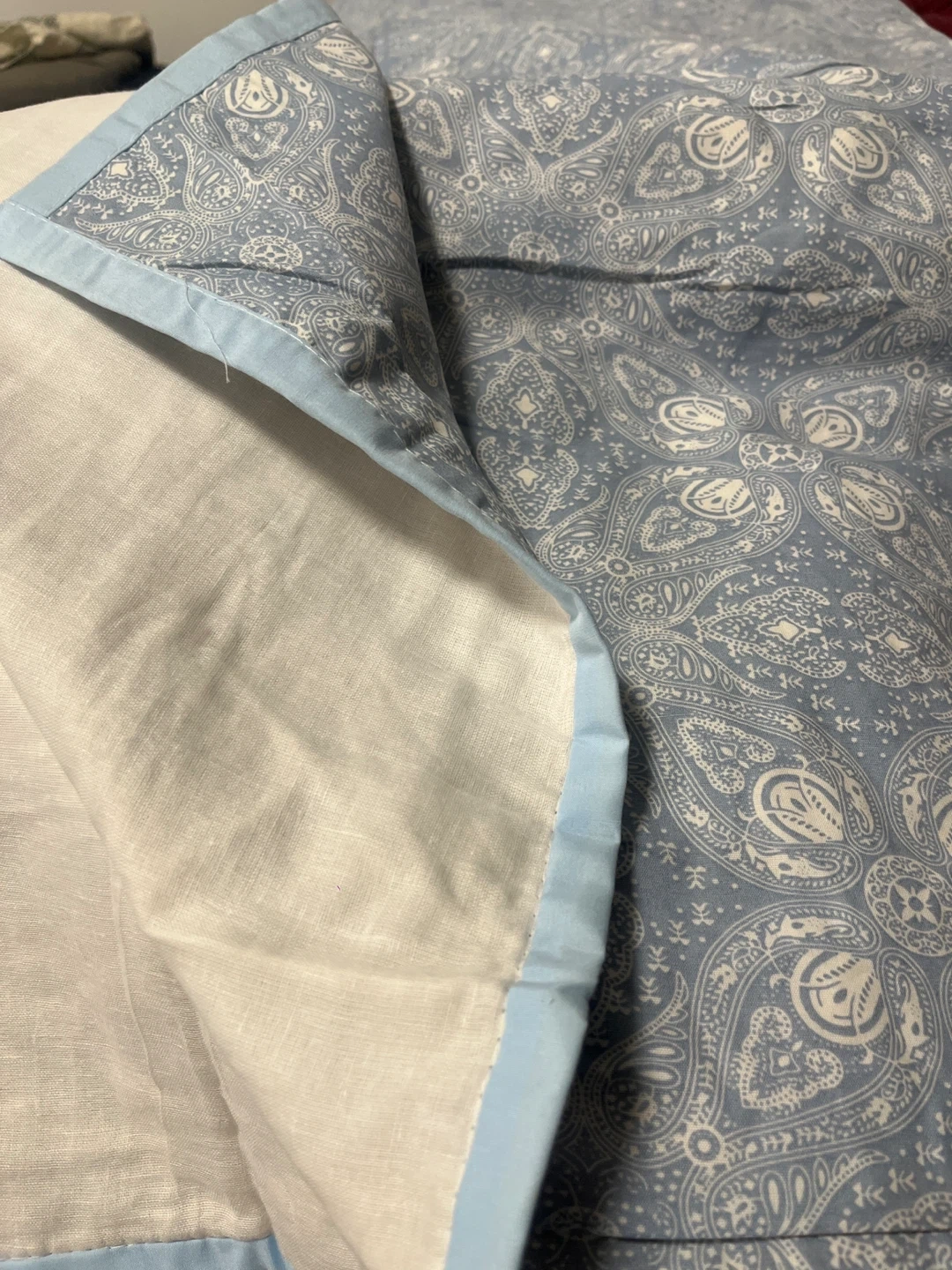Selling a new lovely quilt with a blue and white paisley-like pattern. It's in great condition and would add a nice touch to any bedroom or living space. The quilt features a light blue border and a white underside. Perfect for adding a cozy feel to your home!