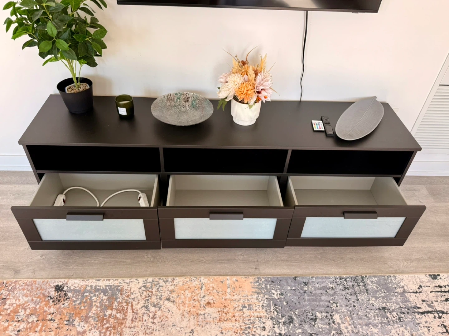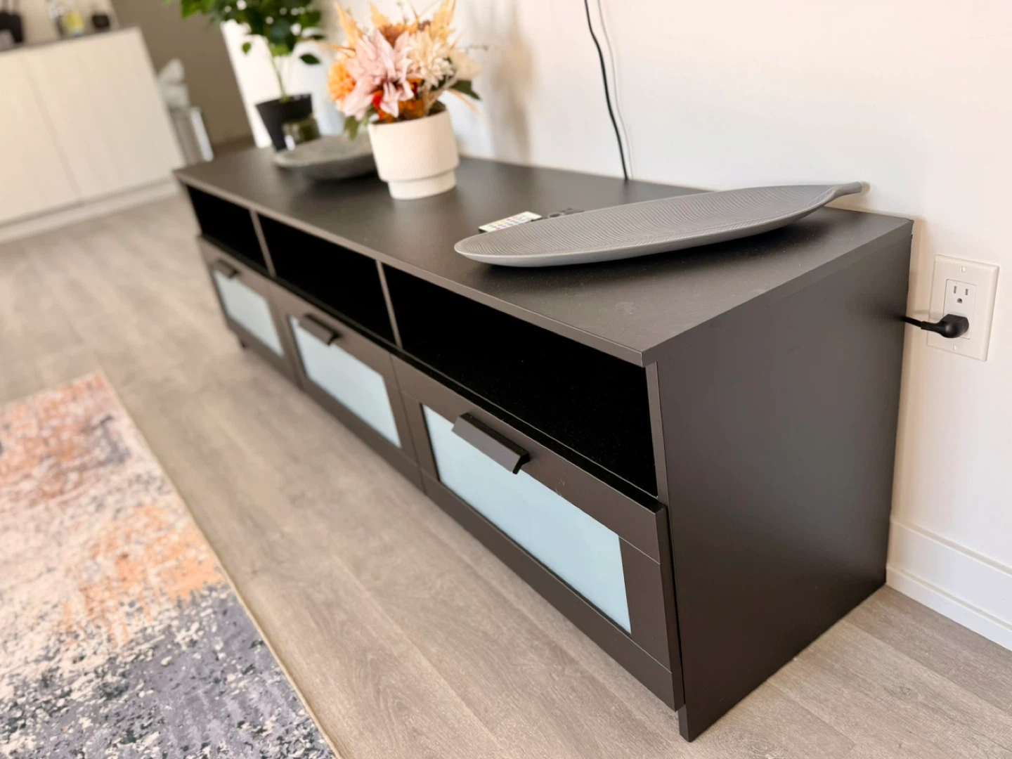 Selling a gently used IKEA BRIMNES TV stand in black. Dimensions are 70 7/8” x 16 1/8” x 20 7/8”. Comes with three spacious drawers and open compartments for media devices. Features cable management holes at the back for a clean setup. In excellent condition. https://applink.ikea.com/tY8M9r9M4w--40569486--ca--en Available November 1st only!