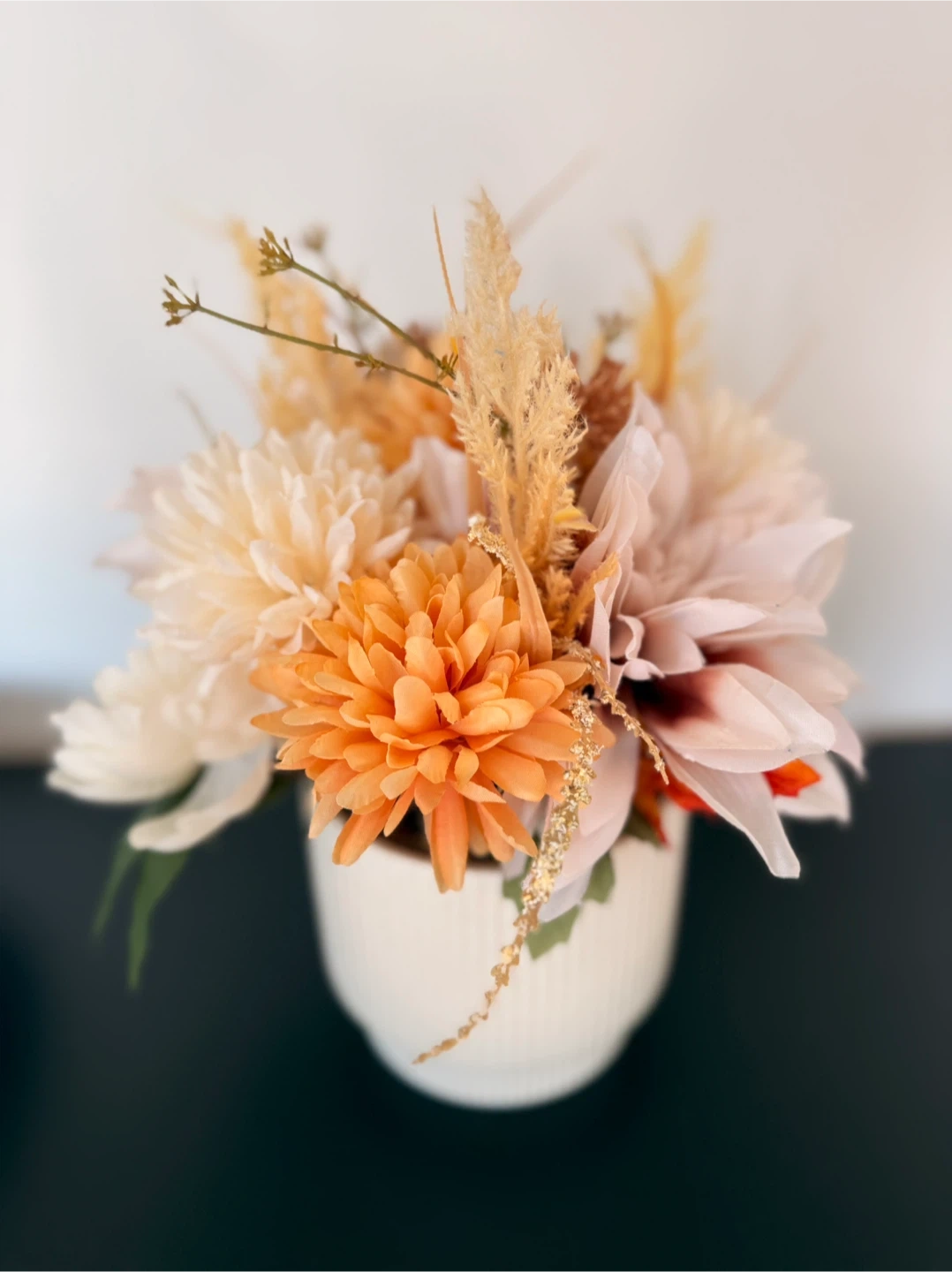 Bring the warmth of the season indoors! This stunning, low-maintenance faux arrangement features soft autumnal tones in a modern, textured ceramic vase. Perfect for adding a cozy touch to any space.
