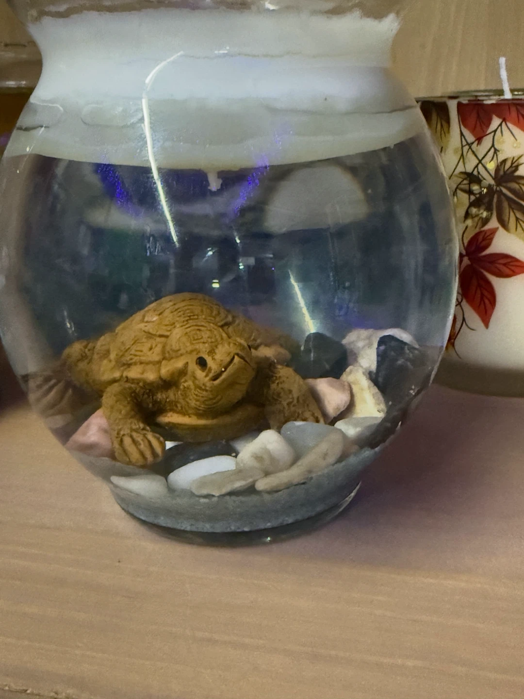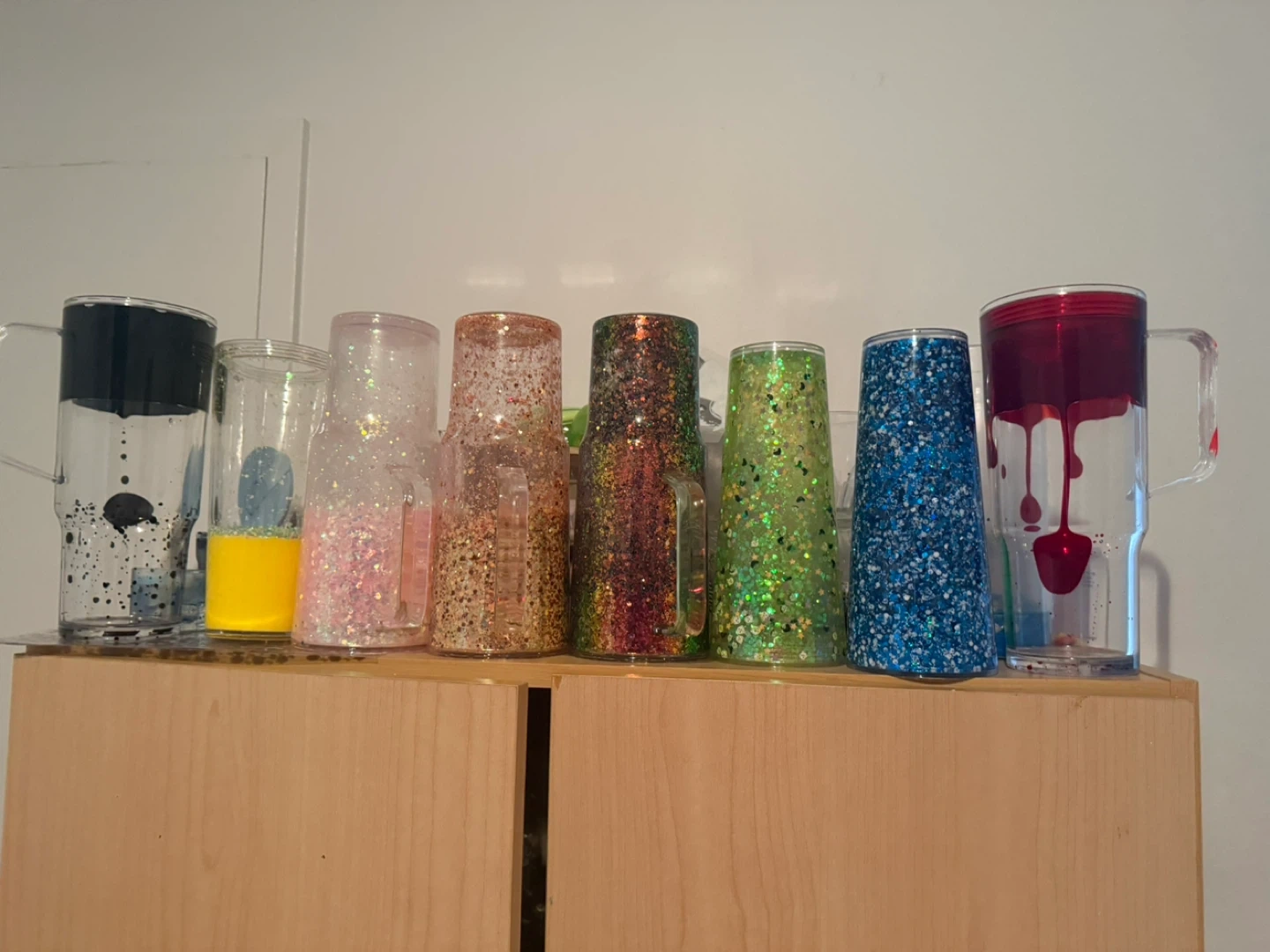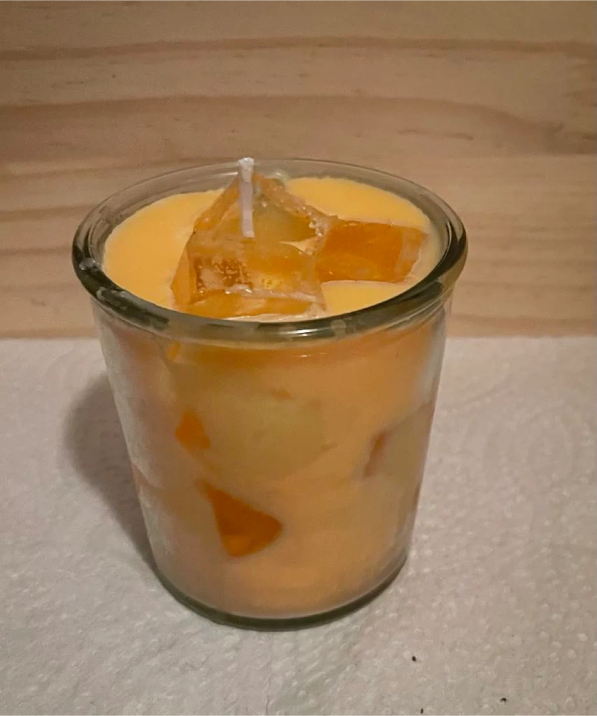 I'm selling a handmade orange candle in a uniquely shaped glass container. It's perfect for adding a warm, cozy glow to any room. Also included is a decorative tumbler with balloon dog designs and glitter accents, great for adding a fun touch to your drinkware collection!